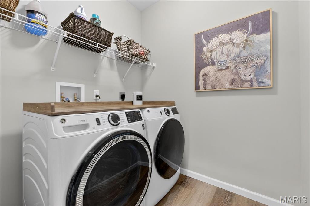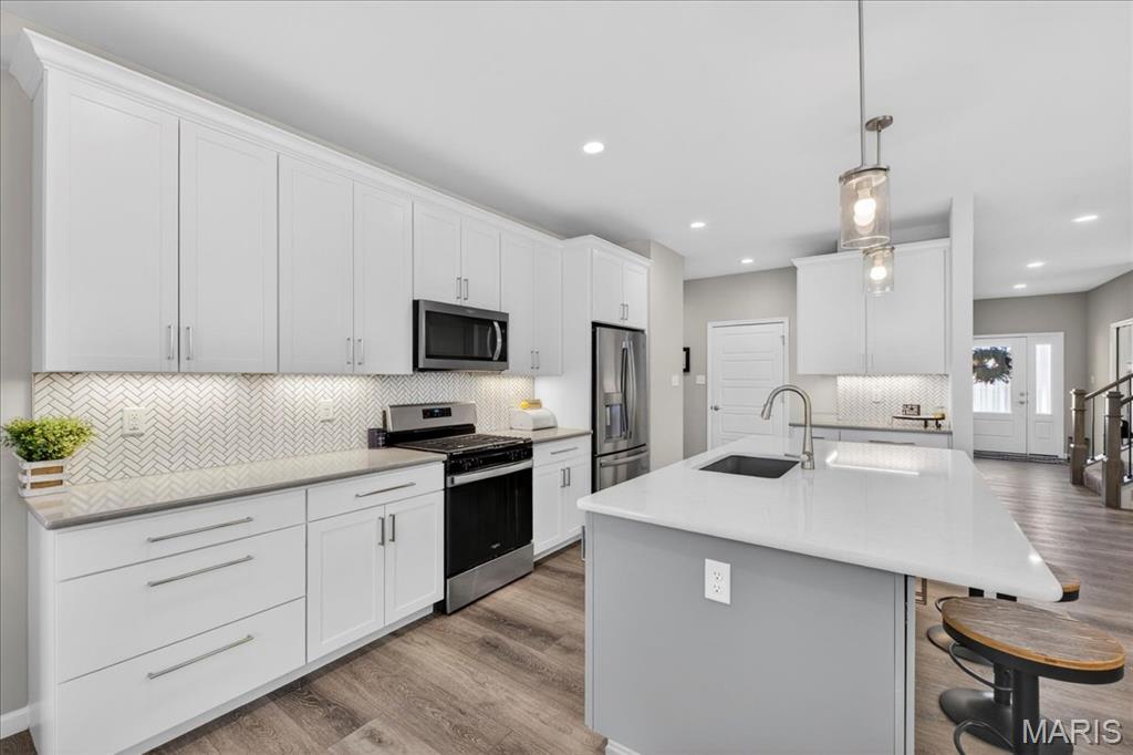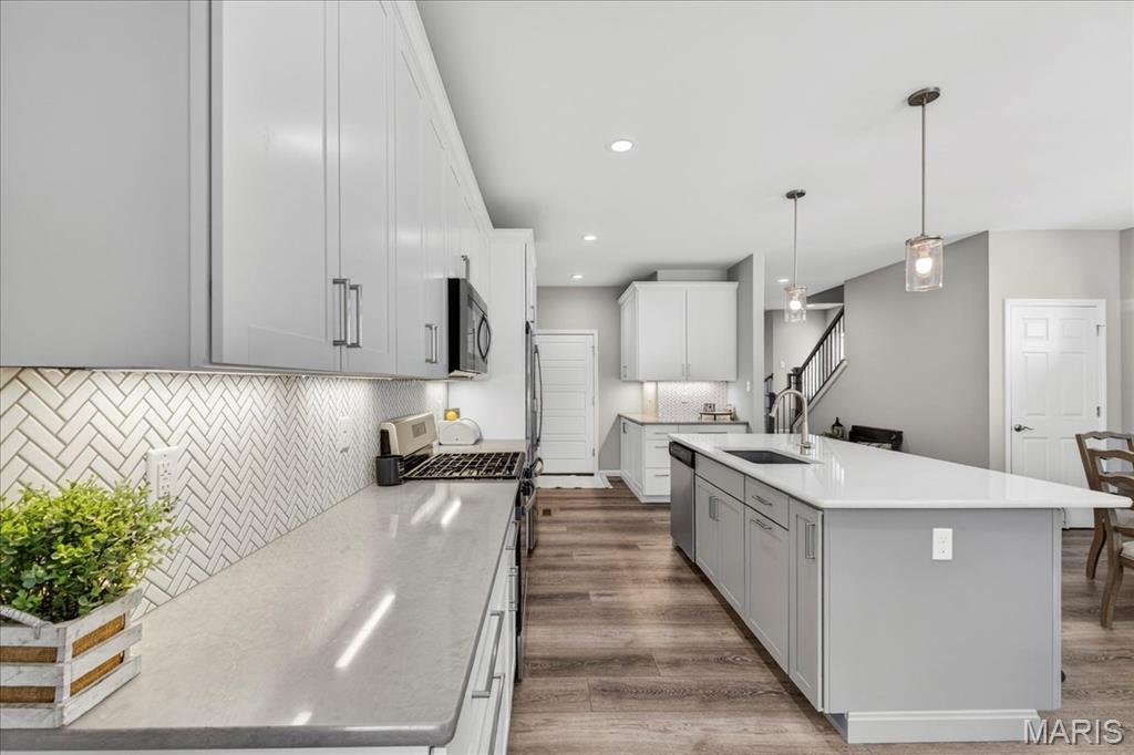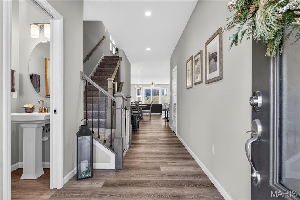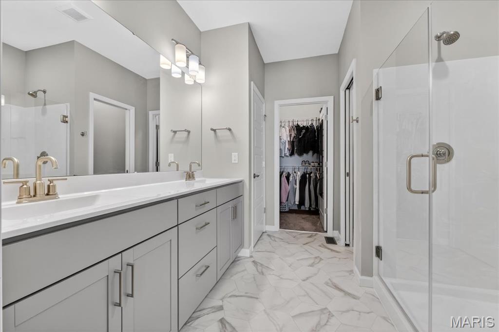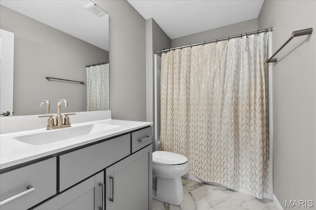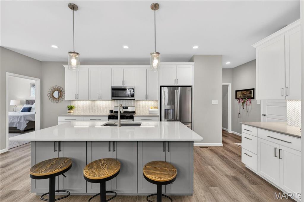 Like-new, only 3 years old, Fischer & Frichtel 1.5-story free-standing villa offering the perfect blend of luxury and low-maintenance living. Step inside to a spacious open floor plan highlighted by 9-foot ceilings that enhance the light and airy feel throughout. The stunning kitchen is a true showstopper, featuring quartz countertops, tile backsplash, custom 42" white cabinets with crown molding, stainless steel appliances, an oversized center island with seating, a wrap-around butler’s pantry, and an additional walk-in pantry. The kitchen opens seamlessly to the dedicated dining area with a beautiful chandelier and the family room, complete with an electric fireplace and access to the back patio—ideal for relaxing or entertaining. The main-level primary suite features a generous bedroom and a luxurious en-suite bath, complete with double vanities, a walk-in shower, a private commode area, and a spacious walk-in closet. A convenient laundry room and guest powder room complete the main level. Upstairs, you’ll find a large bonus room, two generously sized bedrooms, and a full bath. The lower level is ready for your finishing touches, featuring an egress window and rough-in plumbing for additional living space. Additional highlights include a 2-car attached garage, professional landscaping, zoned HVAC, and an amenity-rich community with lakes, pavilion, community gardens, and common grounds. Enjoy easy, low-maintenance living in this beautiful villa. Move-in ready with modern finishes and thoughtful design throughout.