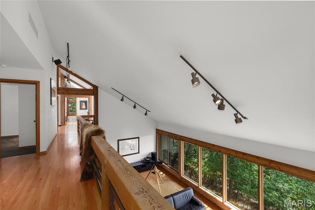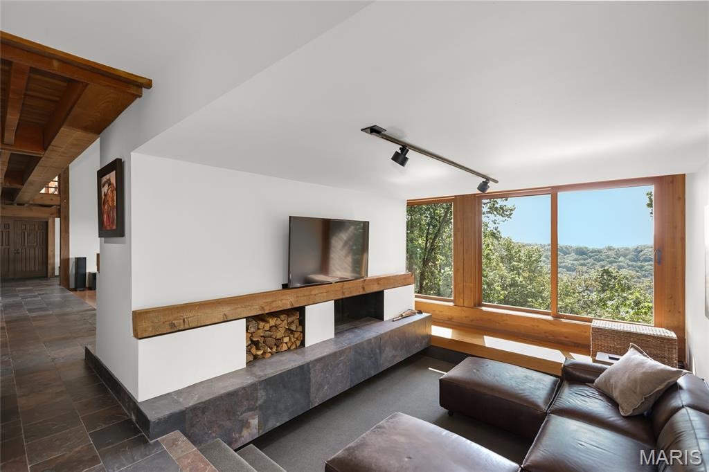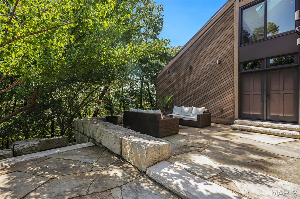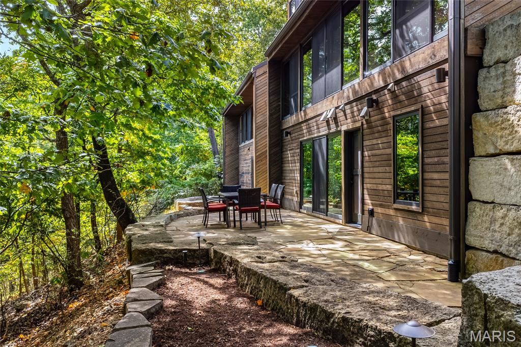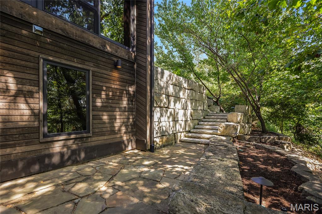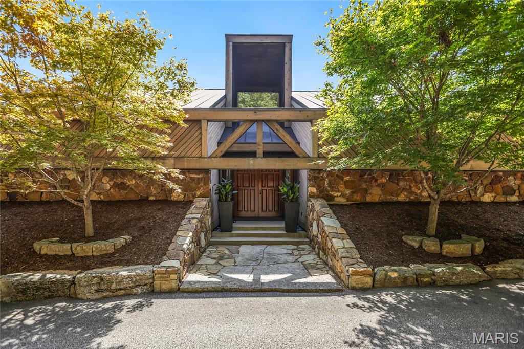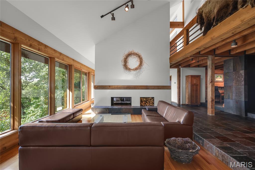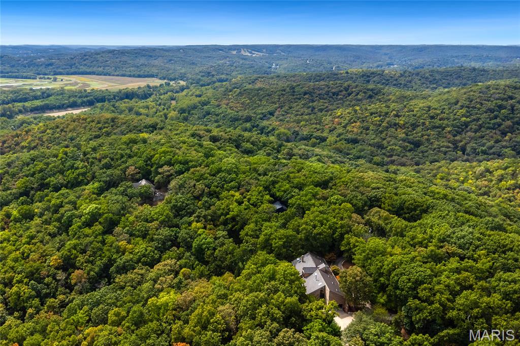 A true architectural masterpiece, this extraordinary 3.5-acre estate was custom designed & solely owned by a well-known St Louis-based architect, & offers sweeping, unobstructed views of the Meramec River Valley. With over 6,500sqft of total living space, this one-of-a-kind home is designed to showcase the landscape with a dramatic wall of windows that spans the main living areas, flooding the interior with natural light & treetop vistas for miles. Main level features formal dining, sleek modern kitchen, library, powder room, 2-story great room & family room divided by a see-thru fireplace. Private primary suite features vaulted sleeping area with skylight views of the stars & bath with freestanding soaking tub & custom walk-in shower. Discover another vaulted living space with a wall of glass, slate floors & 2nd large fireplace, a wide gallery-style hallway, & a stunning mudroom with circular staircase leading to a flexible upper level. This wing includes a 4th bed (currently used as an office with Murphy bed), full bath, & large-sized vaulted bonus space ready for your vision. Walkout lower level offers recreation space, kitchenette, full bath, & storage with additional laundry hookups. Separate exterior entrance leads to a full apartment with kitchen, living room, bed, bath & laundry. Multiple patios & stone pathways surround the home, creating extensive outdoor living spaces designed for entertaining & enjoying the scenery & breathtaking views.
