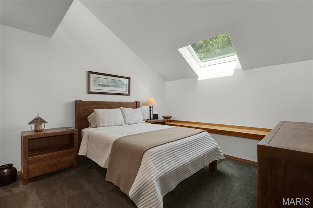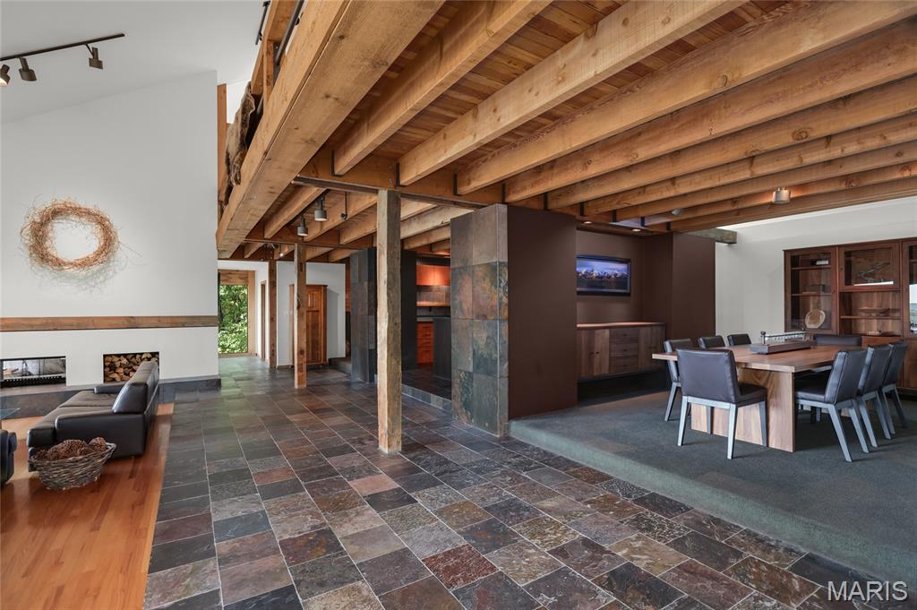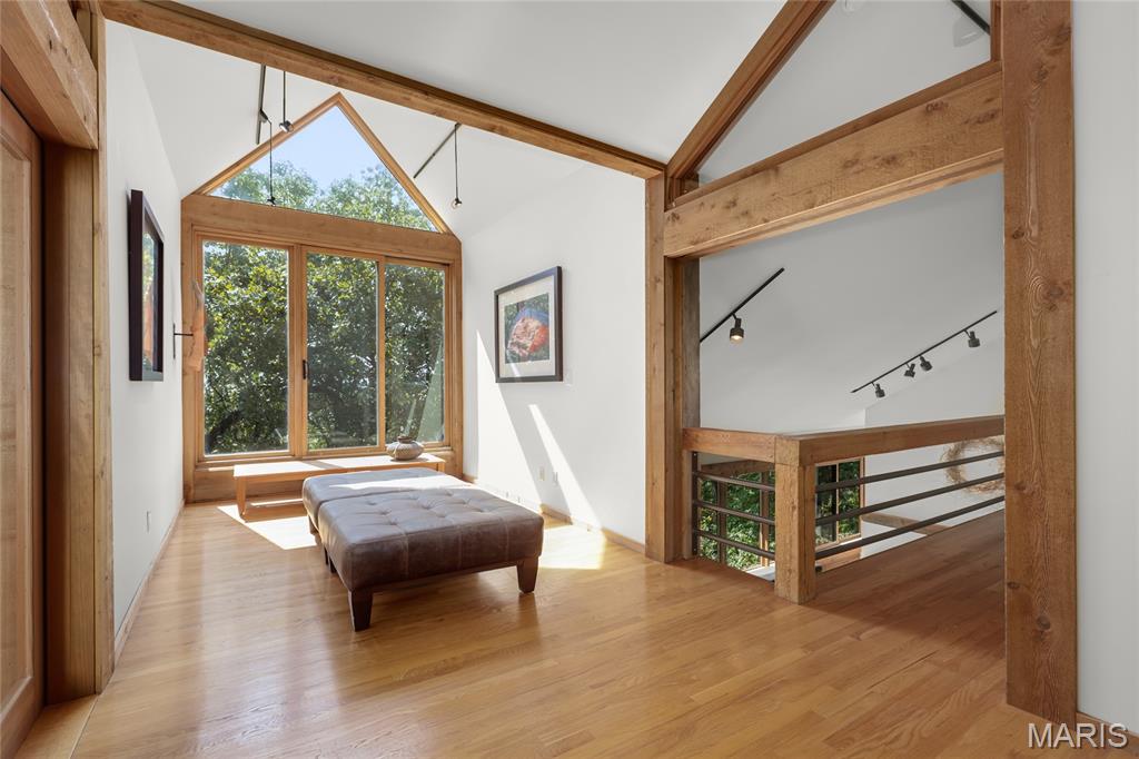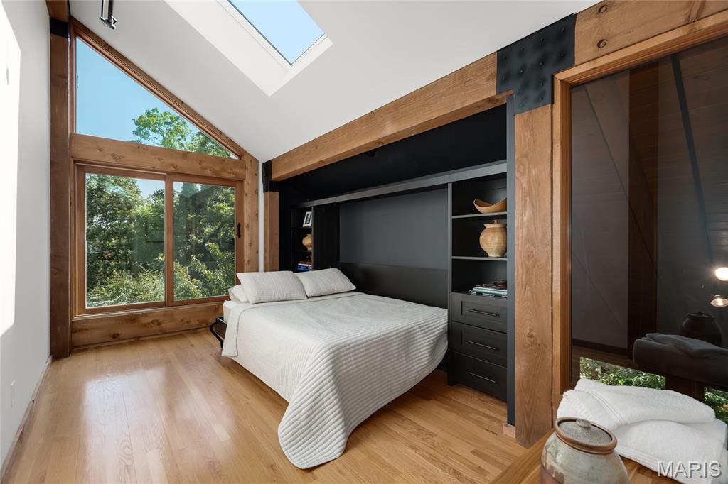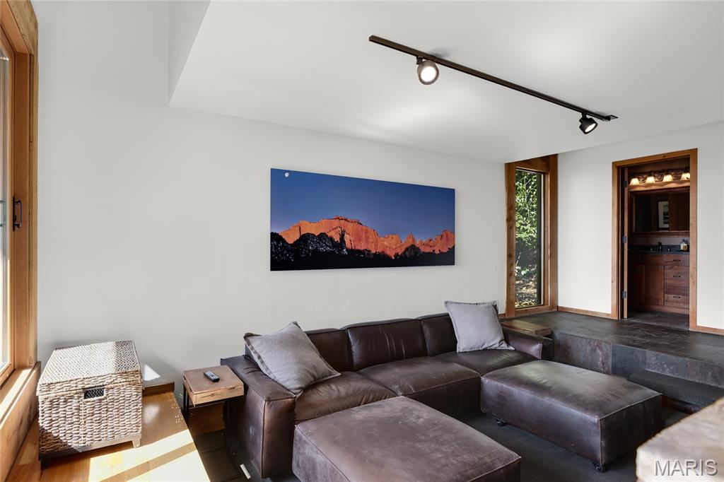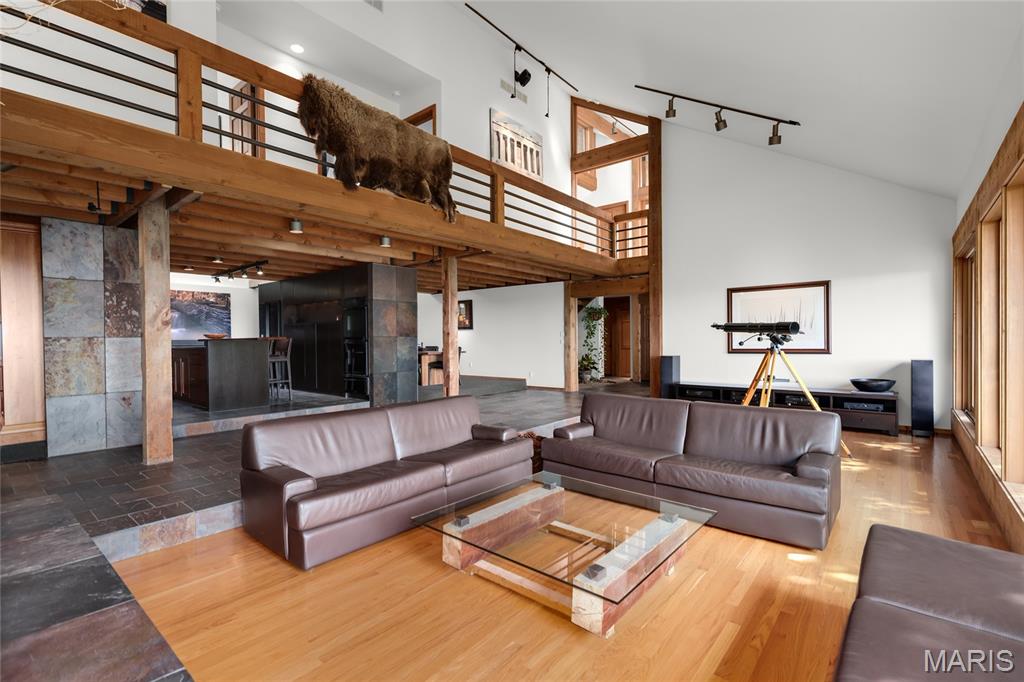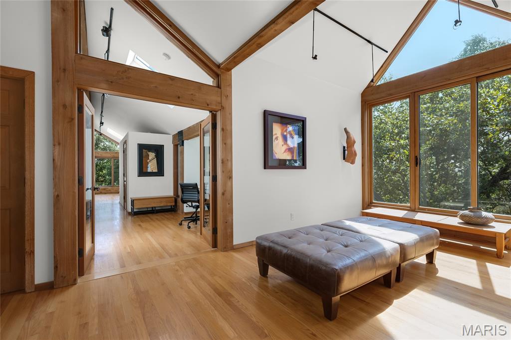 A true architectural masterpiece, this extraordinary 3.5-acre estate was custom designed & solely owned by a well-known St Louis-based architect, & offers sweeping, unobstructed views of the Meramec River Valley. With over 6,500sqft of total living space, this one-of-a-kind home is designed to showcase the landscape with a dramatic wall of windows that spans the main living areas, flooding the interior with natural light & treetop vistas for miles. Main level features formal dining, sleek modern kitchen, library, powder room, 2-story great room & family room divided by a see-thru fireplace. Private primary suite features vaulted sleeping area with skylight views of the stars & bath with freestanding soaking tub & custom walk-in shower. Discover another vaulted living space with a wall of glass, slate floors & 2nd large fireplace, a wide gallery-style hallway, & a stunning mudroom with circular staircase leading to a flexible upper level. This wing includes a 4th bed (currently used as an office with Murphy bed), full bath, & large-sized vaulted bonus space ready for your vision. Walkout lower level offers recreation space, kitchenette, full bath, & storage with additional laundry hookups. Separate exterior entrance leads to a full apartment with kitchen, living room, bed, bath & laundry. Multiple patios & stone pathways surround the home, creating extensive outdoor living spaces designed for entertaining & enjoying the scenery & breathtaking views.