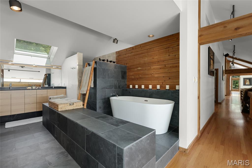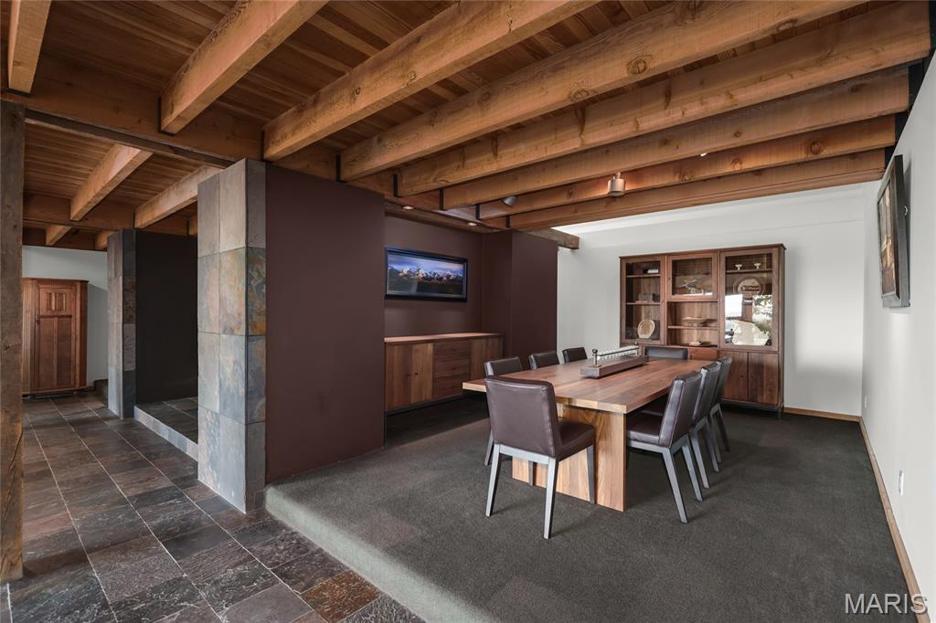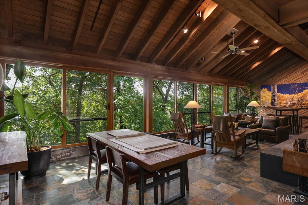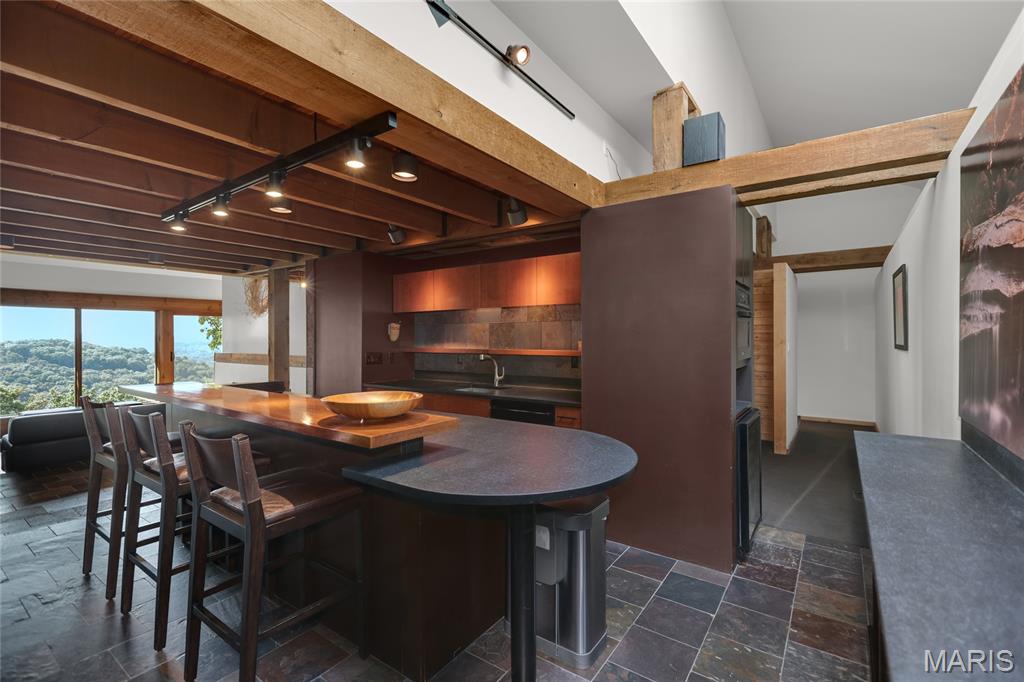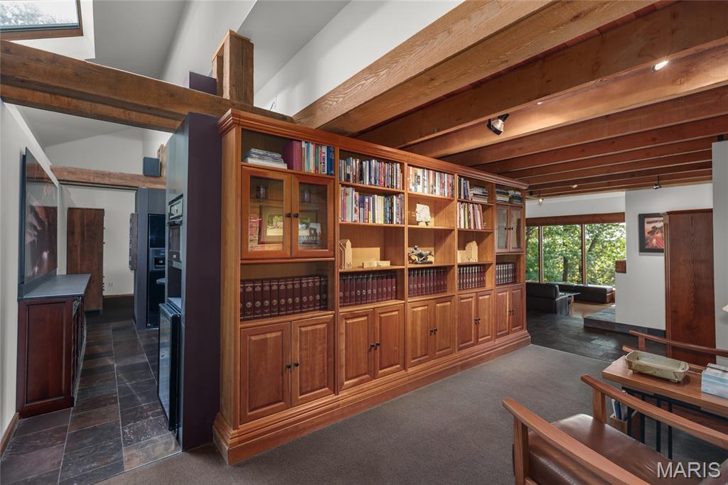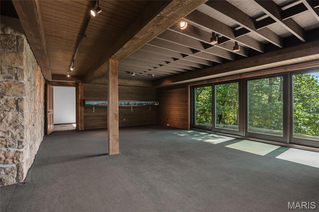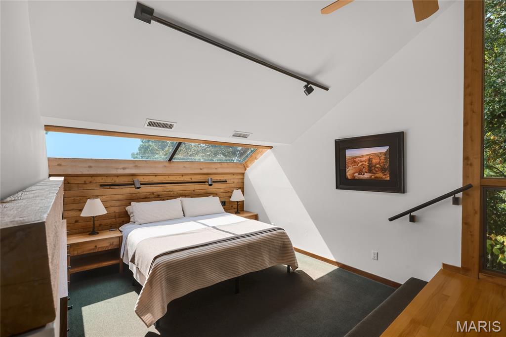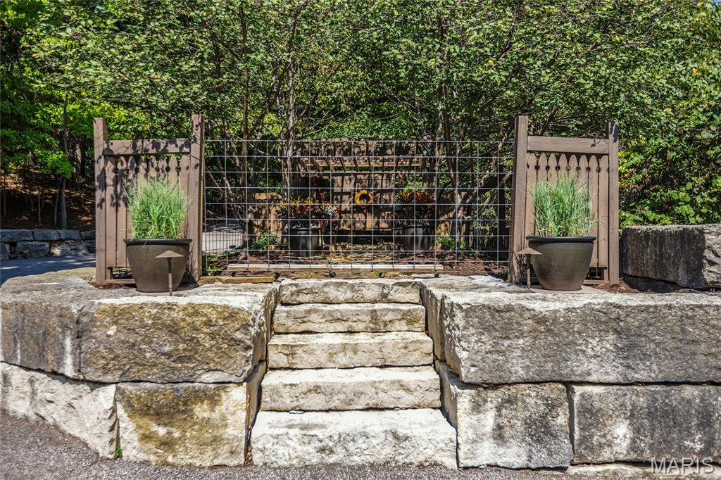 A true architectural masterpiece, this extraordinary 3.5-acre estate was custom designed & solely owned by a well-known St Louis-based architect, & offers sweeping, unobstructed views of the Meramec River Valley. With over 6,500sqft of total living space, this one-of-a-kind home is designed to showcase the landscape with a dramatic wall of windows that spans the main living areas, flooding the interior with natural light & treetop vistas for miles. Main level features formal dining, sleek modern kitchen, library, powder room, 2-story great room & family room divided by a see-thru fireplace. Private primary suite features vaulted sleeping area with skylight views of the stars & bath with freestanding soaking tub & custom walk-in shower. Discover another vaulted living space with a wall of glass, slate floors & 2nd large fireplace, a wide gallery-style hallway, & a stunning mudroom with circular staircase leading to a flexible upper level. This wing includes a 4th bed (currently used as an office with Murphy bed), full bath, & large-sized vaulted bonus space ready for your vision. Walkout lower level offers recreation space, kitchenette, full bath, & storage with additional laundry hookups. Separate exterior entrance leads to a full apartment with kitchen, living room, bed, bath & laundry. Multiple patios & stone pathways surround the home, creating extensive outdoor living spaces designed for entertaining & enjoying the scenery & breathtaking views.