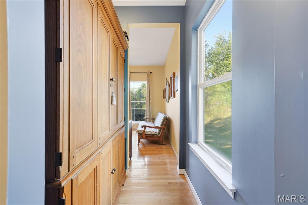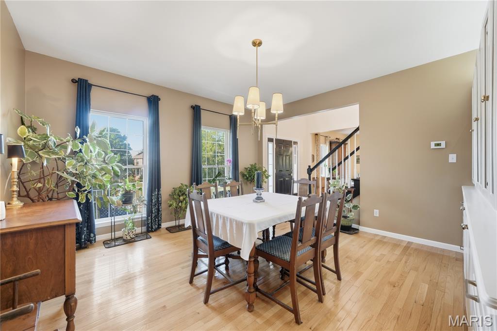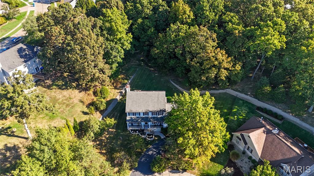 Striking 2-story home at the end of a cul-de-sac with a huge private and landscaped yard. You'll enjoy peaceful mornings and sunset views perched up on the double front porch. Inside is open and airy with an impressive 2-story entry foyer, gorgeous double staircase, 9 foot ceilings and wood floors throughout the main floor. The dining room has custom built-ins that stay, ready to house all your drinkware and entertaining supplies. Kitchen is equipped with 42" solid wood cabinets, granite counters, full-size double oven, backsplash and a HUGE island which is sure to be the spot for many gatherings to come. Open family room with wall of windows, wood burning fireplace and custom wall treatment. Main floor laundry room leads to garage with bonus storage space and mud room. Ascend the staircase to the primary suite, large enough to accommodate a sitting area or desk space, and double closets. The full bath has updated tile flooring, double sinks, soaking tub and separate shower. Three additional spacious rooms with brand new carpeting and a cute hall bath complete the second floor. The real show stopper is the incredible yard with big patio, lots of trees and so much extra parking, outdoor play area and a basketball hoop. Bring your future plans for the basement, there's endless options to finish. Five new replacement windows for the 2nd floor to be installed soon!