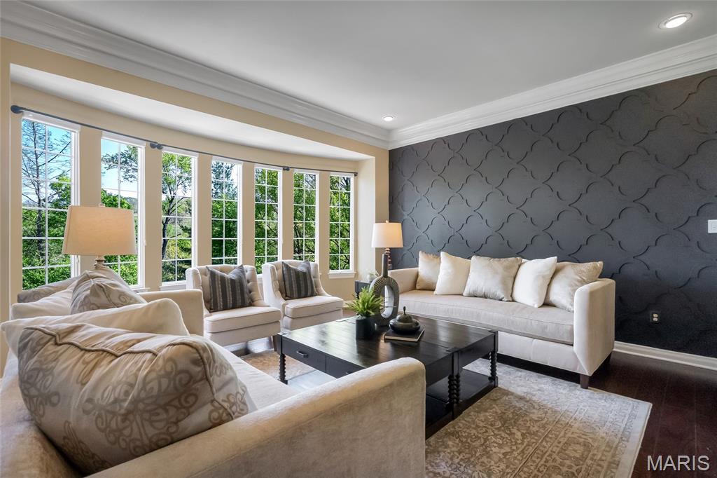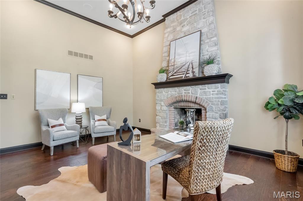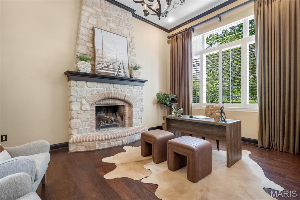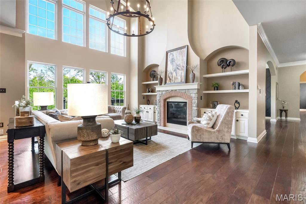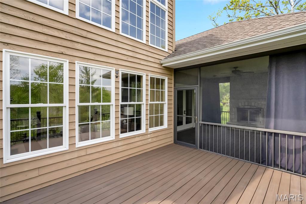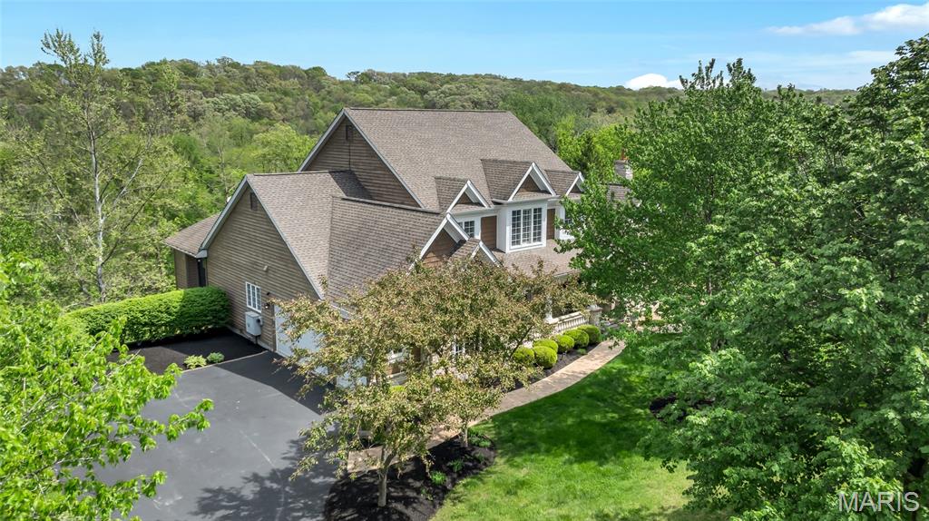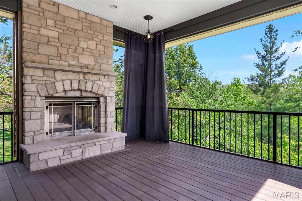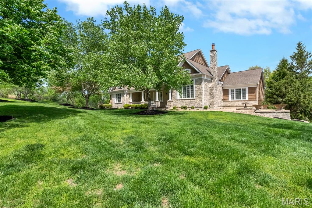Welcome to 18105 Dawns Trail. Stunning Flower Homes 1.5 story build located in sought after Three Sisters Farm subdivision in Wildwood. Nestled on over 3 acres, this 5 bed, 4.5 bath residence impresses with stately exterior curb appeal, stone facade, bespoke wood dual entry door and an expansive covered porch. A grand foyer welcomes you inside with 10 foot ceilings and rich hardwood floors throughout, flanked by the formal dining room featuring crown molding, custom shutters and archway details, as well as the distinguished study with 12 foot ceilings, sliding wood doors and wood burning fireplace. The formal living room boasts a box bow window, statement wall and recessed lighting. The open concept, renovated kitchen includes an impressive center island with seating for six, stone counters, designer cabinetry, high end SS appliances, double wall ovens, ice maker and a built in refrigerator and flows into the two story hearth room featuring a window wall with views of nature and sculptured built ins framing the stone, gas fireplace. The owners suite showcases coffered ceilings, dual walk-in closets and a luxe bath with soaking tub, dual sinks and tiled shower. A spacious mud room with laundry sink and formal powder room complete the main level. The upper level showcases a bonus loft area, 3 guest bedrooms, each with a walk-in closet, serviced by 2 full baths. The light filled walkout lower level features a substantial recreation space and family room with a full wet bar, as well as a library, dedicated media room, additional guest bedroom, full bath, bonus space and ample storage.. Step outside onto the covered, screened deck area and enjoy the outdoor fireplace, or entertain guests on the connecting open deck area. Below you find a stamped concrete patio with a built in stone fire pit overlooking the private, tree lined backyard. Enjoy the surroundings while sitting at the side courtyard terrace with stone planters. Additional features include a 3 car side entry oversized garage, full irrigation, convenient access to amenities and highways located in award winning Rockwood School District boundaries. Extensive Features and Inclusions List available.