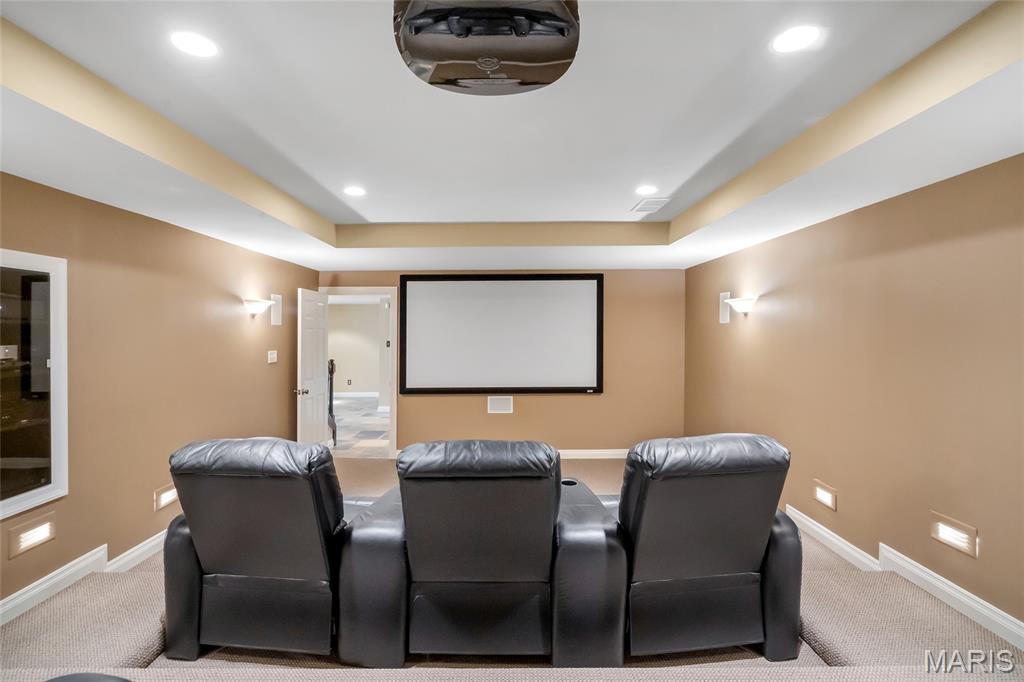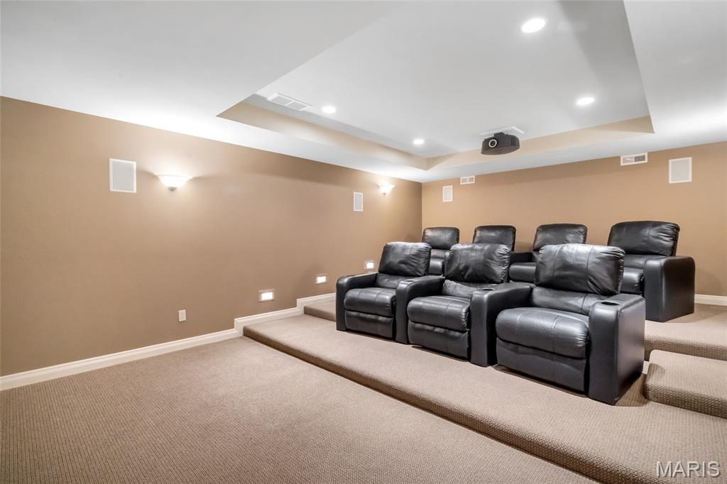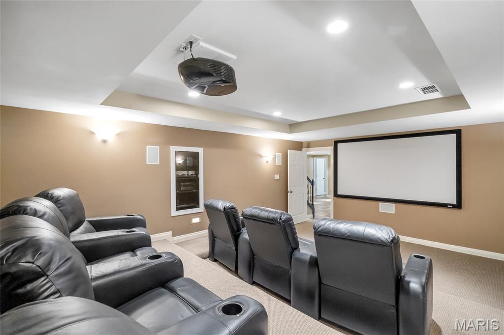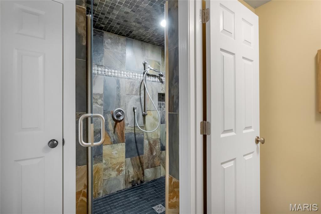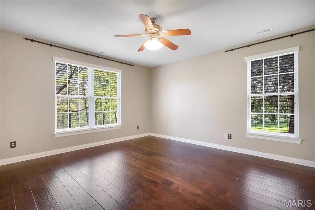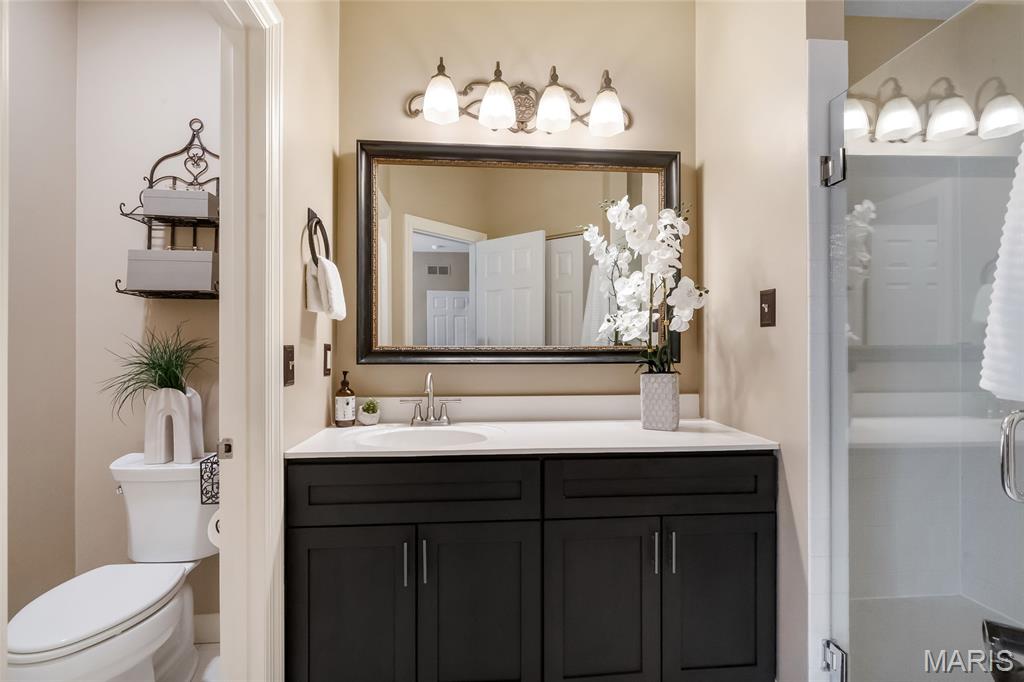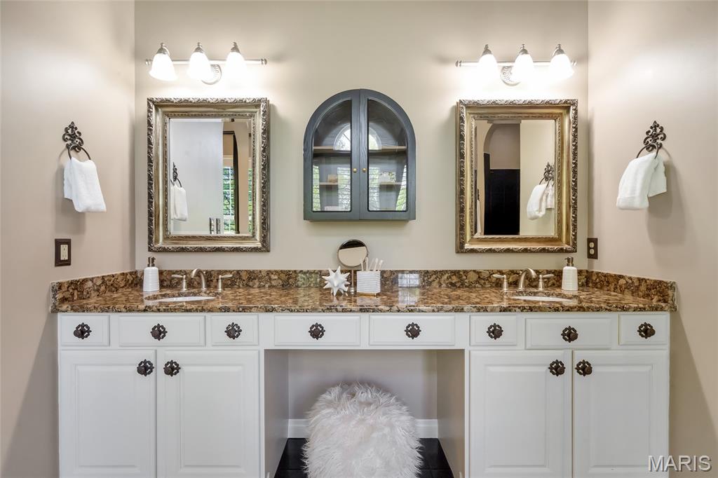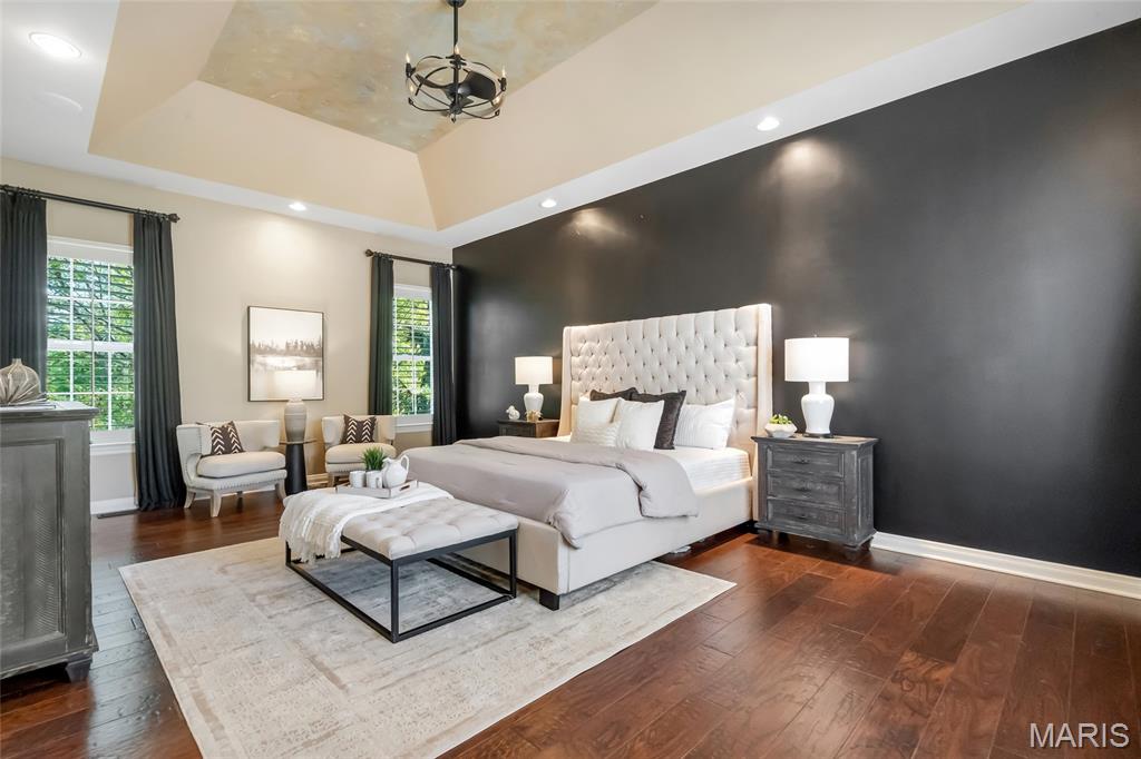 Welcome to 18105 Dawns Trail. Stunning Flower Homes 1.5 story build located in sought after Three Sisters Farm subdivision in Wildwood. Nestled on over 3 acres, this 5 bed, 4.5 bath residence impresses with stately exterior curb appeal, stone facade, bespoke wood dual entry door and an expansive covered porch. A grand foyer welcomes you inside with 10 foot ceilings and rich hardwood floors throughout, flanked by the formal dining room featuring crown molding, custom shutters and archway details, as well as the distinguished study with 12 foot ceilings, sliding wood doors and wood burning fireplace. The formal living room boasts a box bow window, statement wall and recessed lighting. The open concept, renovated kitchen includes an impressive center island with seating for six, stone counters, designer cabinetry, high end SS appliances, double wall ovens, ice maker and a built in refrigerator and flows into the two story hearth room featuring a window wall with views of nature and sculptured built ins framing the stone, gas fireplace. The owners suite showcases coffered ceilings, dual walk-in closets and a luxe bath with soaking tub, dual sinks and tiled shower. A spacious mud room with laundry sink and formal powder room complete the main level. The upper level showcases a bonus loft area, 3 guest bedrooms, each with a walk-in closet, serviced by 2 full baths. The light filled walkout lower level features a substantial recreation space and family room with a full wet bar, as well as a library, dedicated media room, additional guest bedroom, full bath, bonus space and ample storage.. Step outside onto the covered, screened deck area and enjoy the outdoor fireplace, or entertain guests on the connecting open deck area. Below you find a stamped concrete patio with a built in stone fire pit overlooking the private, tree lined backyard. Enjoy the surroundings while sitting at the side courtyard terrace with stone planters. Additional features include a 3 car side entry oversized garage, full irrigation, convenient access to amenities and highways located in award winning Rockwood School District boundaries. Extensive Features and Inclusions List available.