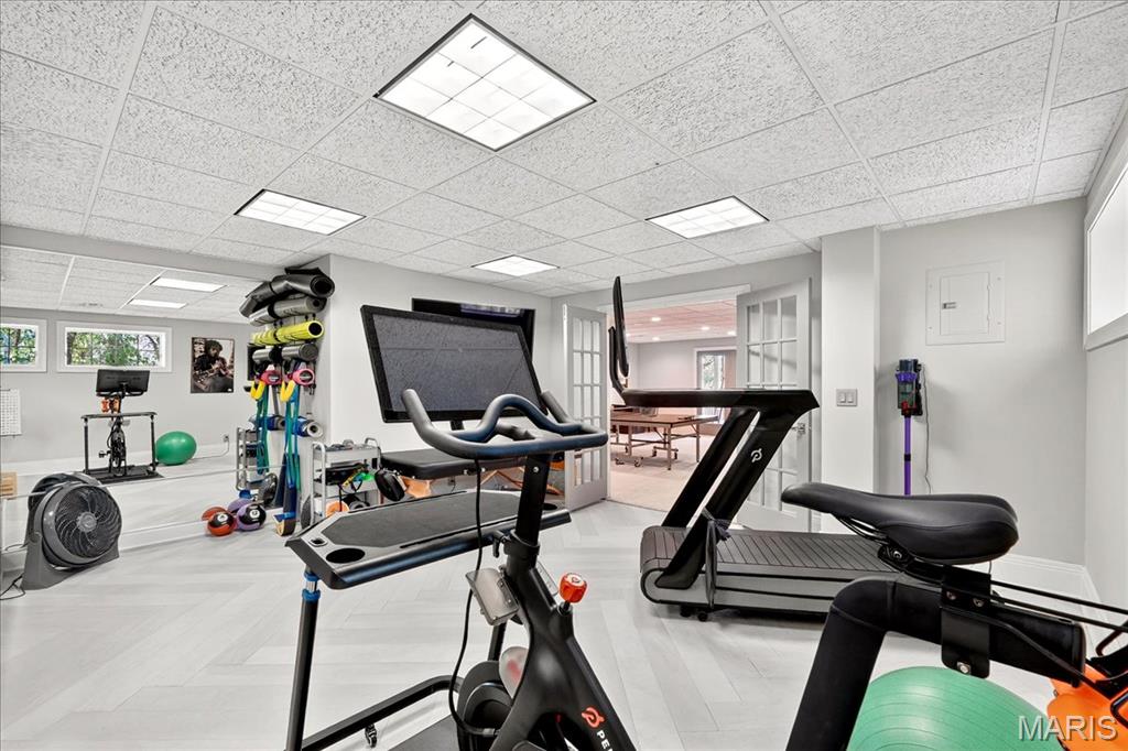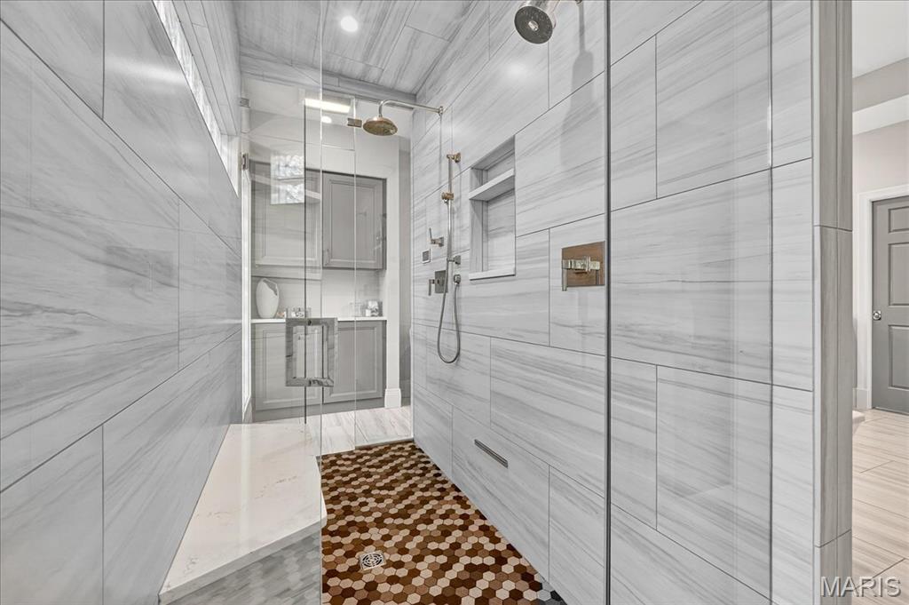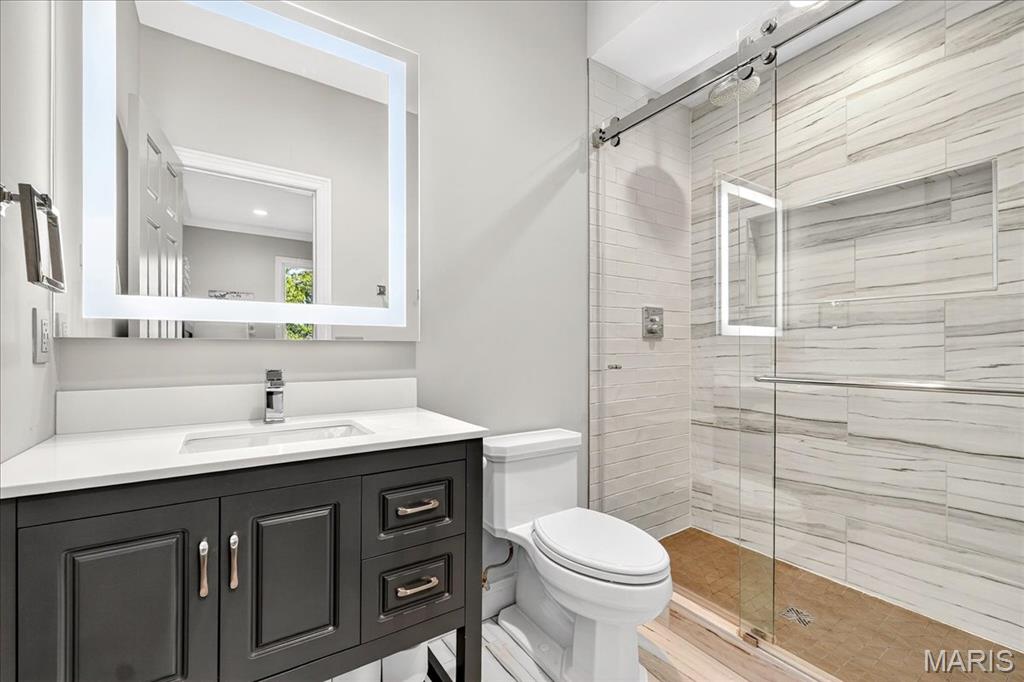 Privately positioned at the end of a cul-de-sac in the coveted Lewis Spring Farms subdivision, this extraordinary five-bedroom, four-and-a-half-bathroom estate sits on just over three acres of sculpted landscape and offers more than 8,400+ square feet of fully renovated, designer-curated interiors that deliver modern, bespoke elegance amid woodland seclusion. Redesigned entry garden anchored by a sculptural fountain guides you inside, where a dramatic two-story foyer welcomes you. Gleaming hardwood flooring carries throughout the main and upper levels, arched doorways with custom moulding frame every sightline, and a cohesive designer lighting package featuring Restoration Hardware chandeliers and Hinkley architectural fixtures adds layered warmth and emphasis throughout. The richly appointed study is wrapped in warm natural wood and showcases custom built-ins, a soaring vaulted ceiling with a statement chandelier, and an expansive arched window. The formal dining room impresses with a coffered ceiling, bay-window views, and effortless flow for gatherings from intimate dinners to holiday celebrations. The stately, two-story living room is anchored by a newly designed honed marble gas fireplace and hearth, flanked by floor-to-ceiling windows that frame serene wooded views, while custom millwork and refined signature lighting complete the composition. At the heart of the home, a newly reimagined chef’s kitchen shines with custom Shiloh cabinetry and Danby marble surfaces met with a professional, built-in stainless appliance suite: GE Monogram refrigerator with companion freezer, GE Café double oven and range with custom vented hood, two sets of refrigerator drawers, two fully integrated dishwashers, built-in microwave, and a Scotsman ice maker, engineered for prep-to-party perfection. The adjoining Hearth Room features a second honed-marble gas fireplace with easy connection to the screened porch and breakfast room. The main-floor primary suite offers a private sanctuary complete with coffered ceilings, layered chandelier lighting, and bay windows opening to a private deck. The spa-inspired ensuite features dual vanities with lighted mirrors, Vicostone Quartz countertops, a frameless glass steam shower with integrated speakers, a separate soaking tub, and two boutique-style walk-in closets. Upstairs, three spacious bedrooms, all with walk-in closets, custom built-in shelving, and ensuite bathroom access, surround a versatile loft area suited for movie nights, games, or a cozy family lounge. The finished lower level expands your entertaining space and steps out to a spacious lower-level deck with peaceful outlooks, while the main family area delivers herringbone LVP floors, plush carpeting, a third honed-marble fireplace and hearth, and a granite-topped wet bar with a dedicated wine refrigerator. Off the main gathering space, the Poker & Pinot room delivers a tailored hideaway with custom-cut natural-wood shelving and an ambiance made for grown-up gatherings. Completing the level are a fifth bedroom, a renovated full bath, and a dedicated gym. Outdoors, sweeping lawns dissolve into woodland privacy as landscape lighting turns dusk into a show and a new Restoration Hardware gas fire pit gathers friends beneath the canopy. An extended driveway leads to a three-car garage and circular motor court, completing the estate’s polished presentation. Perfectly positioned on the Wildwood/Chesterfield border in the Rockwood School District, the estate sits minutes from Chesterfield Valley, Wildwood Town Center, and Future Downtown Chesterfield, marrying sophistication, privacy, and everyday convenience. 16907 Lewis Spring Farms Road stands as a testament to thoughtful design and careful execution: every detail refined, every upgrade purposeful, every space created to elevate how you live.