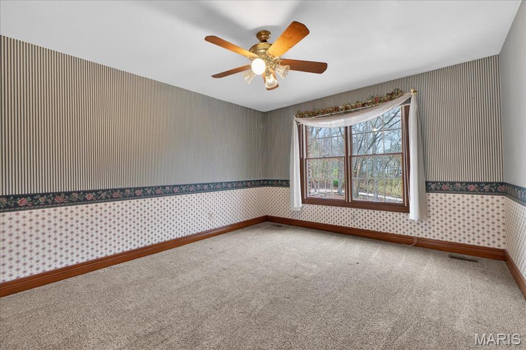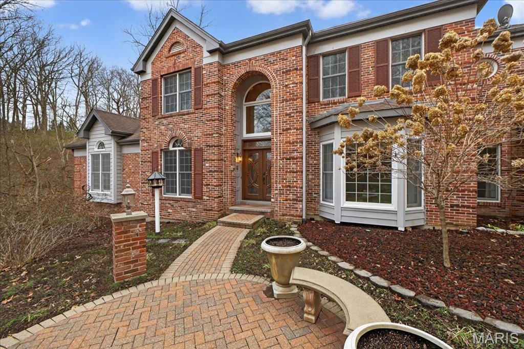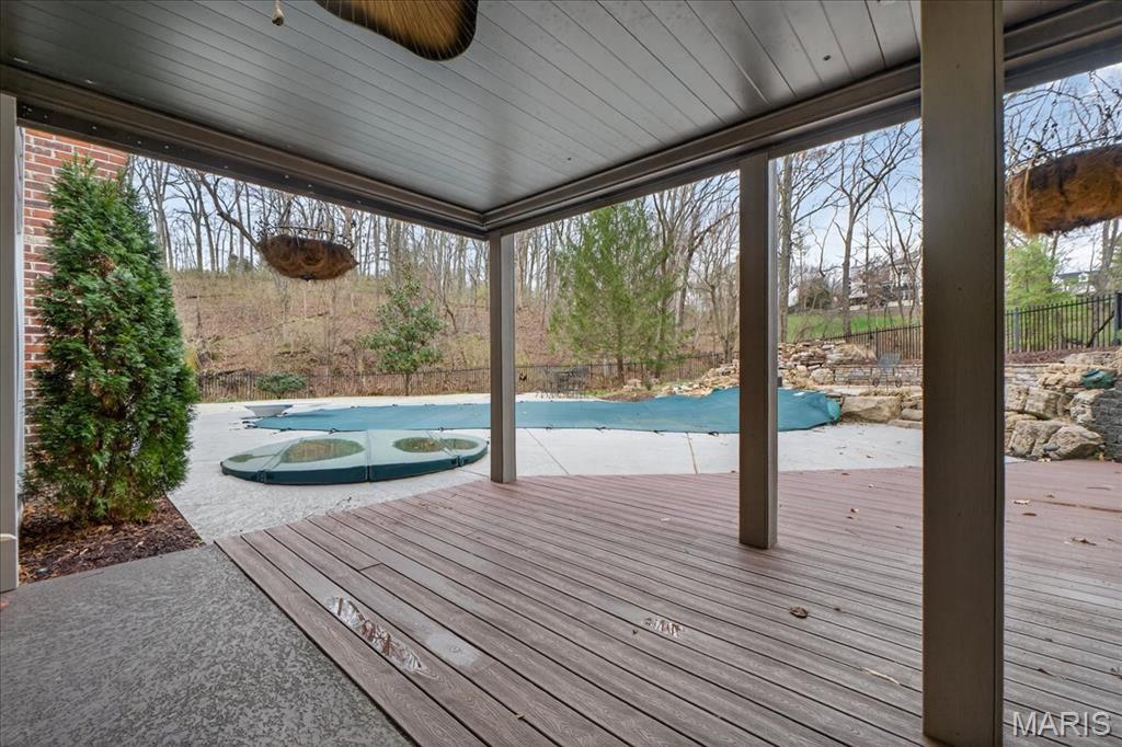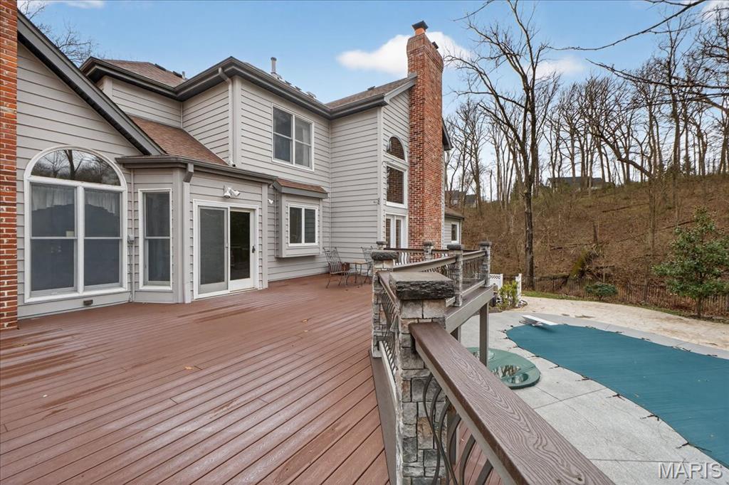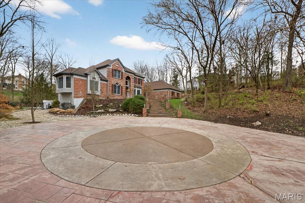 Situated on a private 1.8-acre lot backing to trees, this stately 1.5-story home offers an exceptional setting with remarkable outdoor living, including a private in-ground pool with hot tub and waterfall, fenced yard, circle driveway, and 4-car side-entry garage. The expansive grounds provide rare privacy and space, ideal for entertaining, relaxing, or enjoying the peaceful surroundings. A grand 2-story foyer welcomes you, flanked by a formal dining room and a private study with boxed beam ceiling, built-ins, and French doors. The 2-story great room offers a gas fireplace and walk-up wet bar, while the generous kitchen includes 42" cabinetry, center island, double ovens, gas cooktop, and adjoining breakfast room with access to the composite deck. The vaulted hearth room showcases beamed ceiling and wood-burning fireplace, adding warmth and character to the main living area. The main-level primary suite offers a coffered ceiling, bay window, large walk-in closet plus additional closet, and a spacious bath with double vanities, jetted tub, separate shower, and private commode room. The upper level includes three bedrooms, with one private bath and a Jack-and-Jill bath. The finished walk-out lower level provides an expansive rec room with fireplace, walk-behind wet bar, exercise room, two additional bedrooms, and full bath. Main-level laundry, circle drive, and extensive outdoor living areas add to the home’s appeal. Property to be sold in as-is condition, presenting a wonderful opportunity for the next owner to bring their own vision and personal style to an already impressive home and setting.