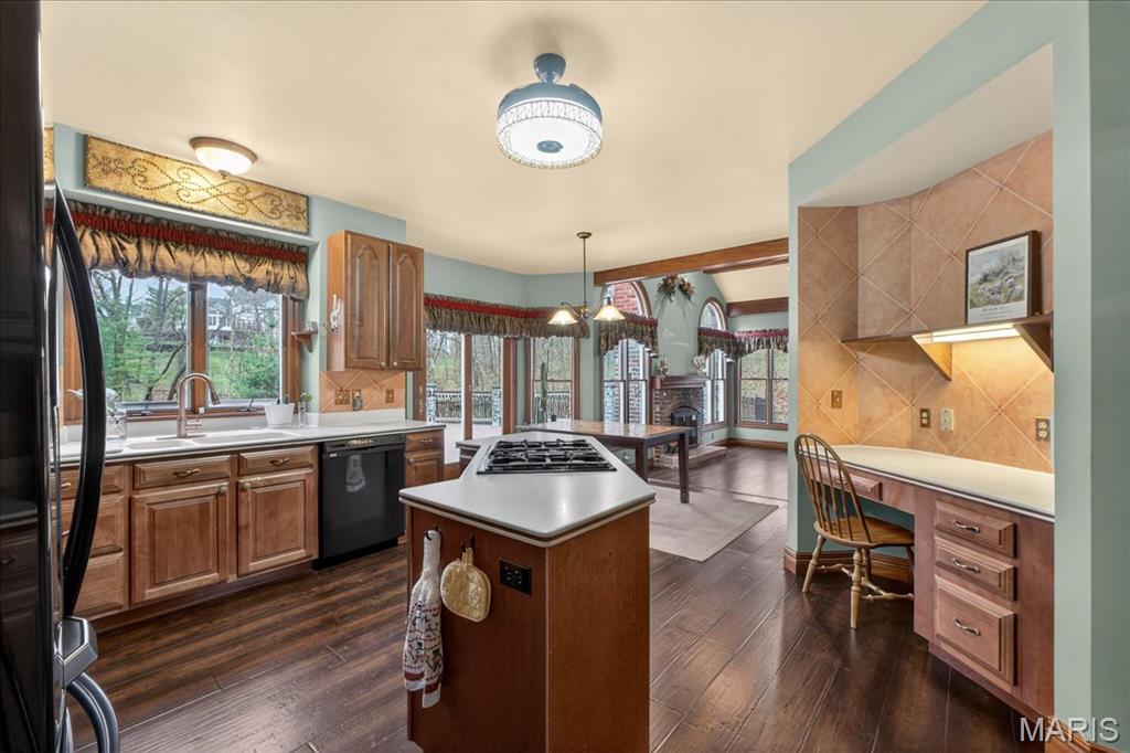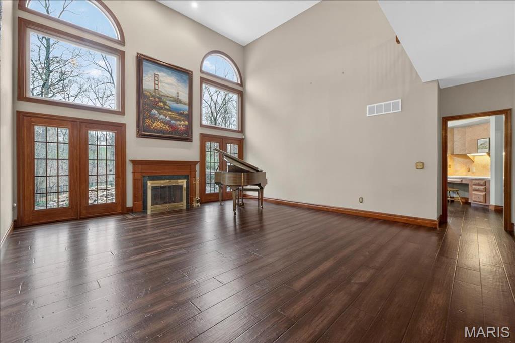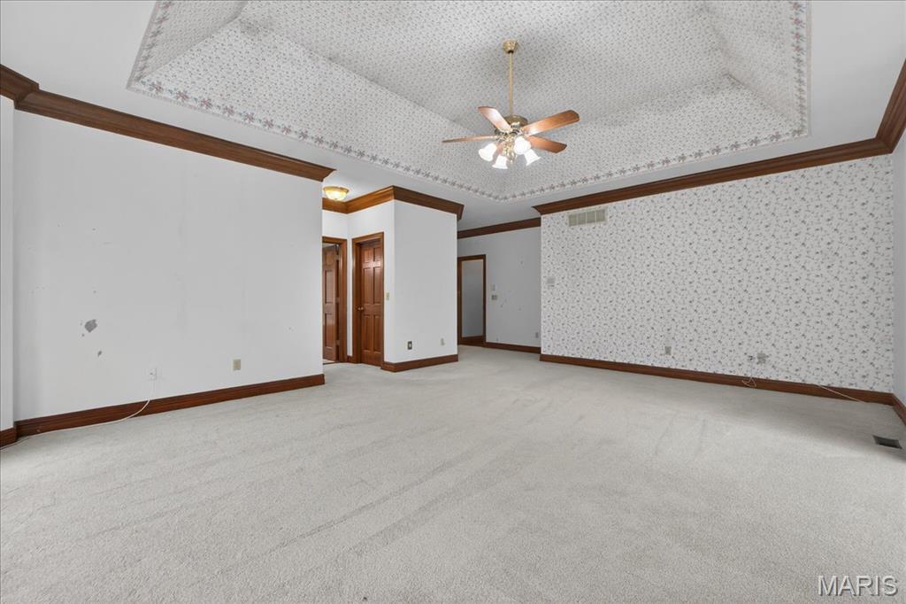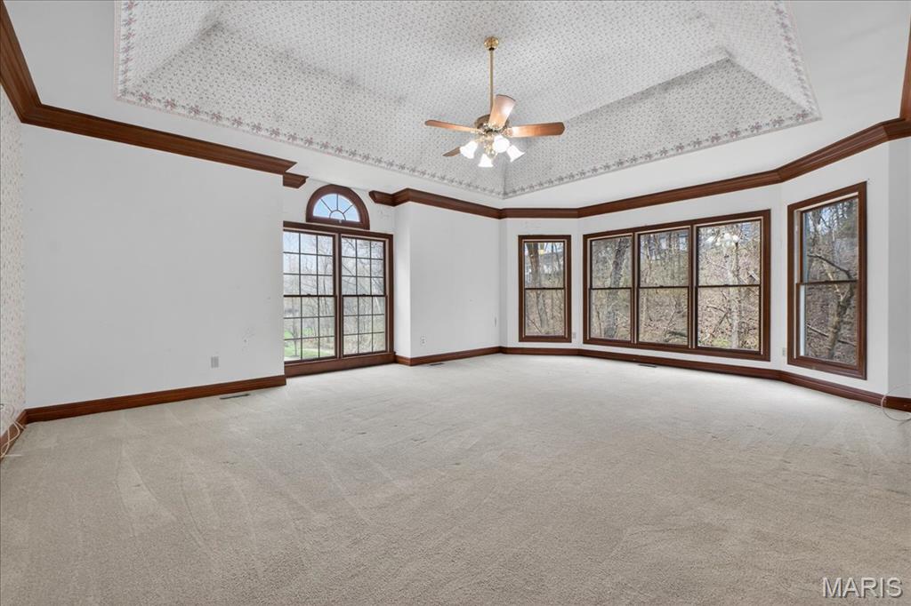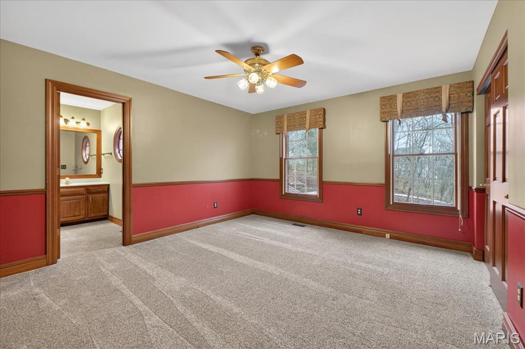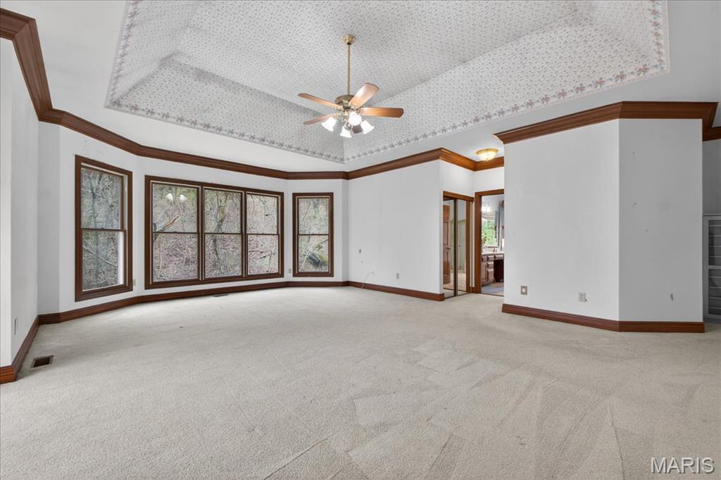 Situated on a private 1.8-acre lot backing to trees, this stately 1.5-story home offers an exceptional setting with remarkable outdoor living, including a private in-ground pool with hot tub and waterfall, fenced yard, circle driveway, and 4-car side-entry garage. The expansive grounds provide rare privacy and space, ideal for entertaining, relaxing, or enjoying the peaceful surroundings. A grand 2-story foyer welcomes you, flanked by a formal dining room and a private study with boxed beam ceiling, built-ins, and French doors. The 2-story great room offers a gas fireplace and walk-up wet bar, while the generous kitchen includes 42" cabinetry, center island, double ovens, gas cooktop, and adjoining breakfast room with access to the composite deck. The vaulted hearth room showcases beamed ceiling and wood-burning fireplace, adding warmth and character to the main living area. The main-level primary suite offers a coffered ceiling, bay window, large walk-in closet plus additional closet, and a spacious bath with double vanities, jetted tub, separate shower, and private commode room. The upper level includes three bedrooms, with one private bath and a Jack-and-Jill bath. The finished walk-out lower level provides an expansive rec room with fireplace, walk-behind wet bar, exercise room, two additional bedrooms, and full bath. Main-level laundry, circle drive, and extensive outdoor living areas add to the home’s appeal. Property to be sold in as-is condition, presenting a wonderful opportunity for the next owner to bring their own vision and personal style to an already impressive home and setting.