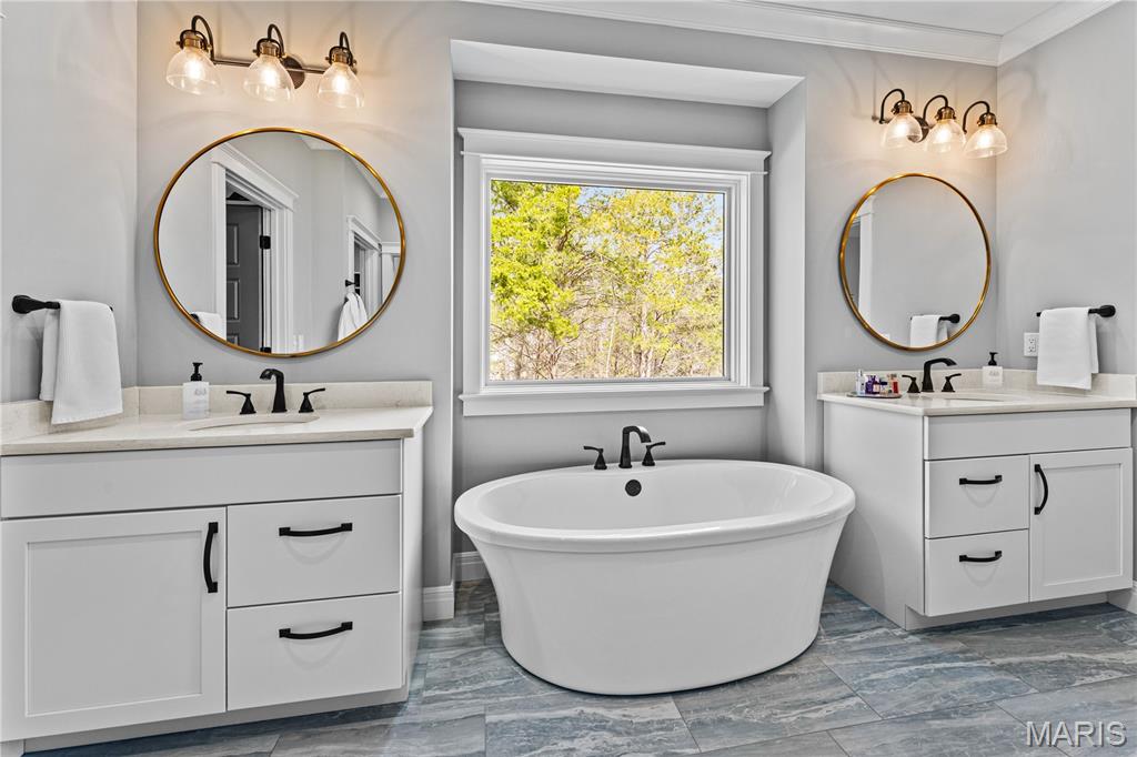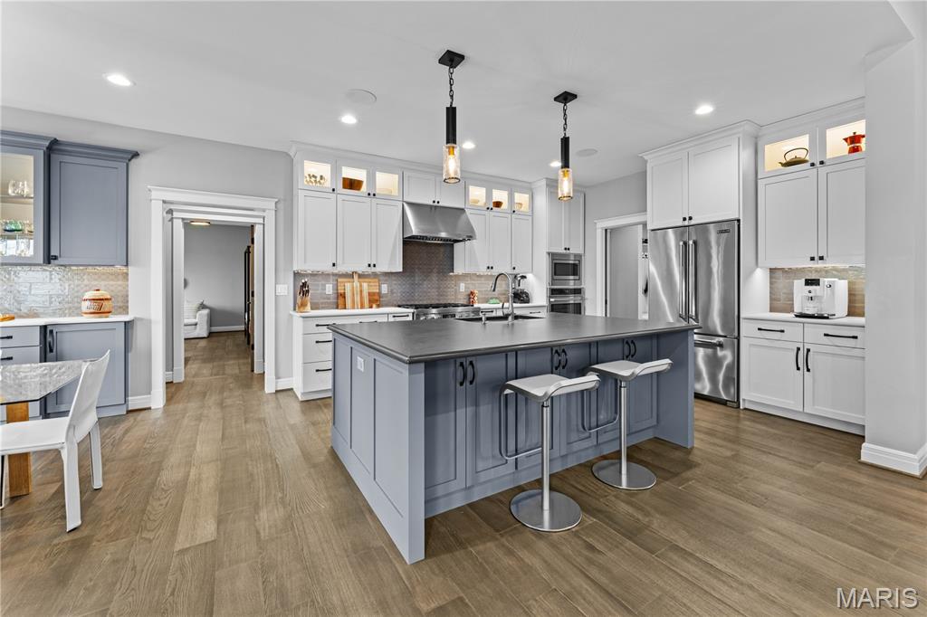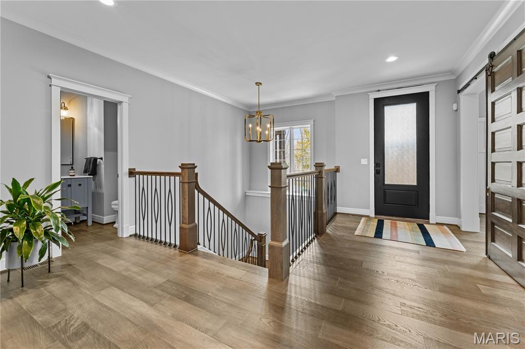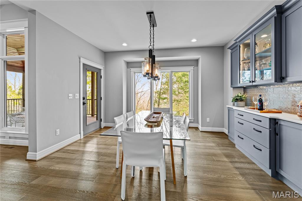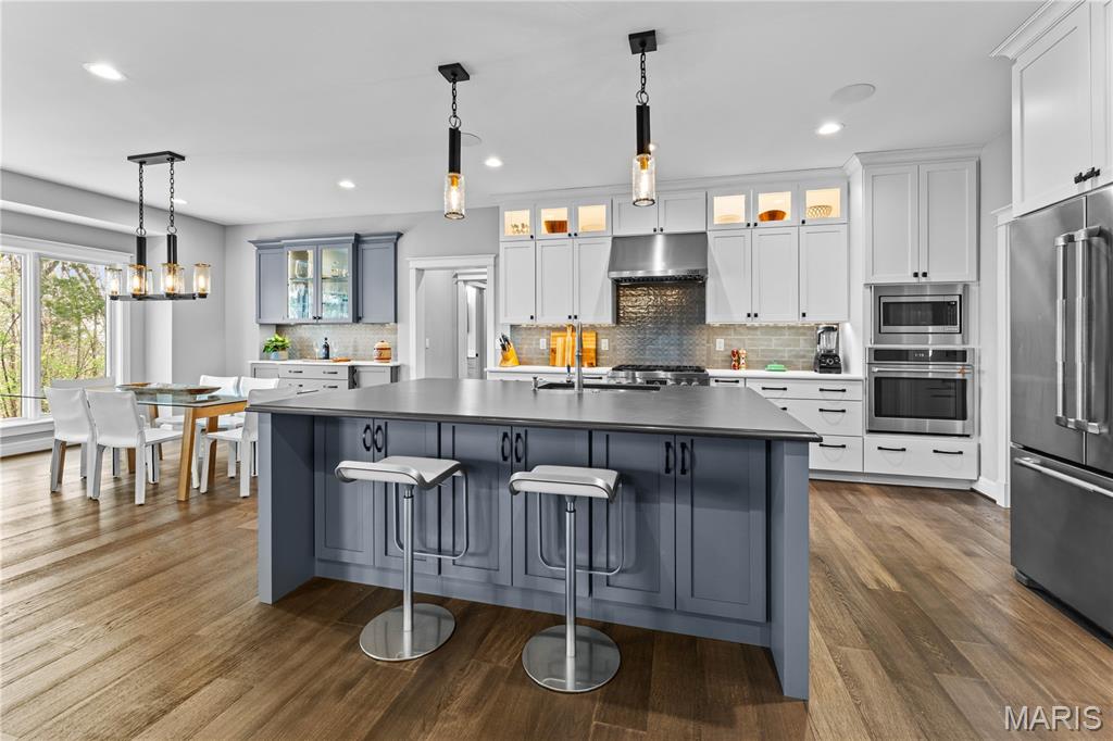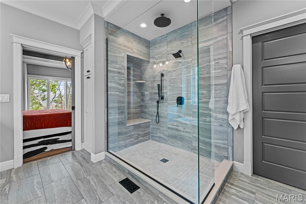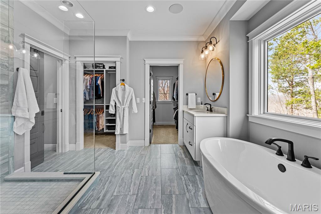 A secluded retreat centered around wellness, comfort, and relaxation. Set on three private acres, this property’s hallmark feature is a custom saltwater pool with an infinity edge that can be both heated and chilled. Gorgeous hardwood floors and fine moldings throughout the main living areas make this home a designer showcase. The main level features an open layout where the kitchen, dining, and great room with gas fireplace connect seamlessly, framed by large windows overlooking the wooded backdrop. The kitchen offers a generous island, professional-grade appliances, custom cabinetry, large bar, walk-in pantry with Costco door and quartz counters. The primary suite is a private retreat with dual walk-in closets, a spa-like bath with a soaking tub, a multi-head shower, a Toto smart toilet, and access to a covered deck. An additional bedroom suite, laundry room, and an office complete the main level. The walk-out lower level has two additional bedrooms, a full bath, and a recreation room with a wet bar. The spa-like feel continues with a well-appointed exercise room including an infrared sauna. This is a complete smart home operated by your phone to simplify everyday living. The three-car garage includes a Tesla charger. Upgraded insulation and energy-efficient systems. In-ceiling speakers throughout the home and deck, a whole-house 24 kW generator, and irrigation system make this an ideal property.