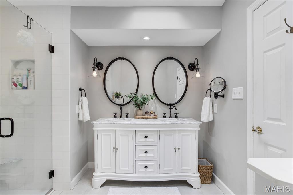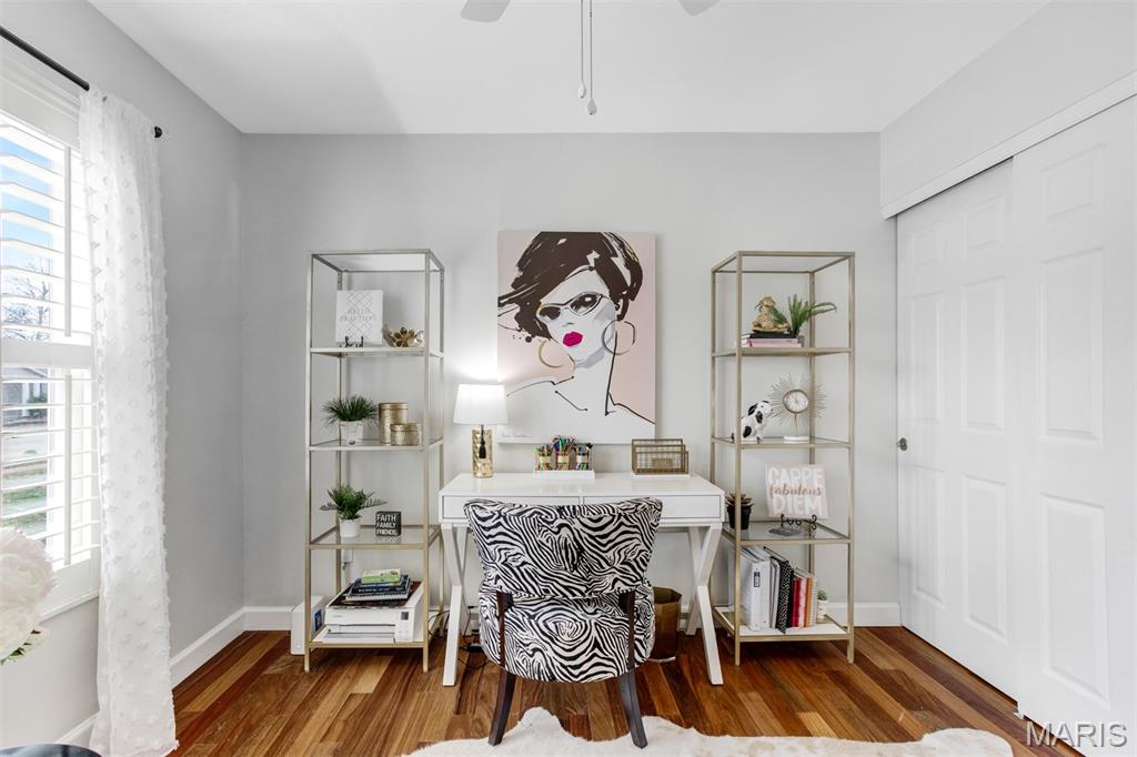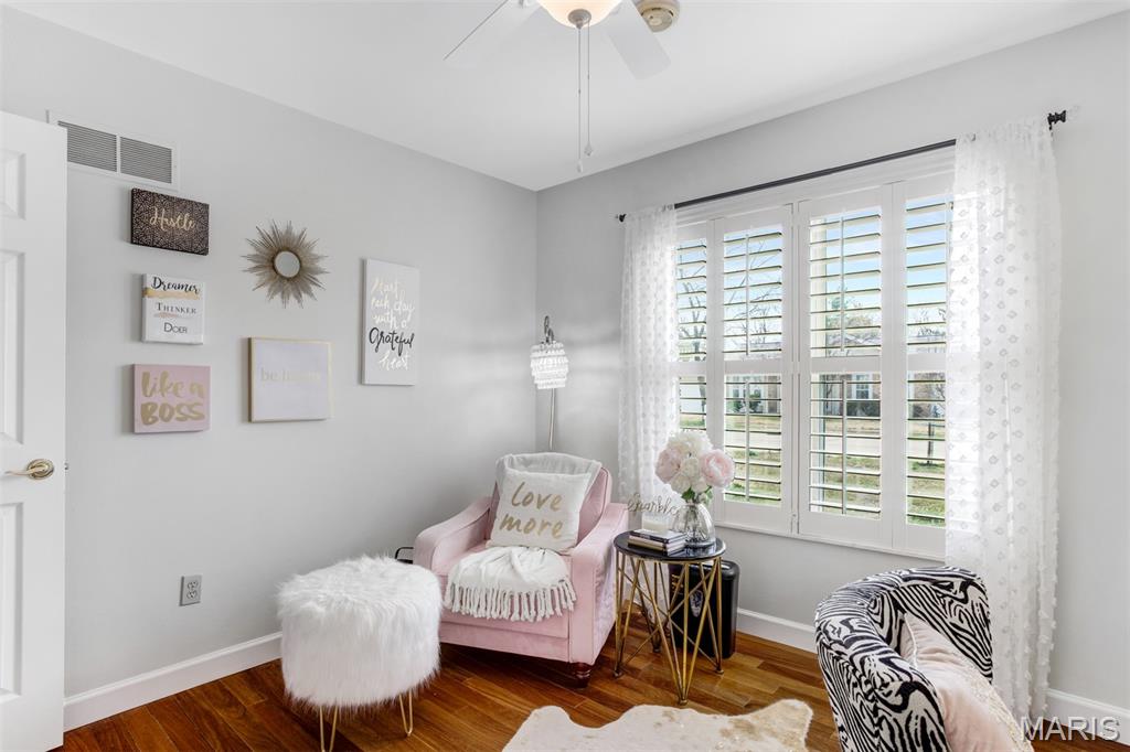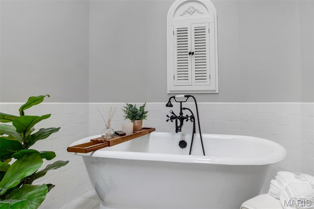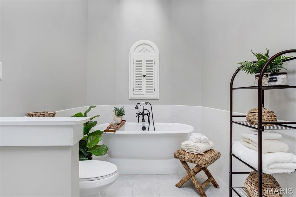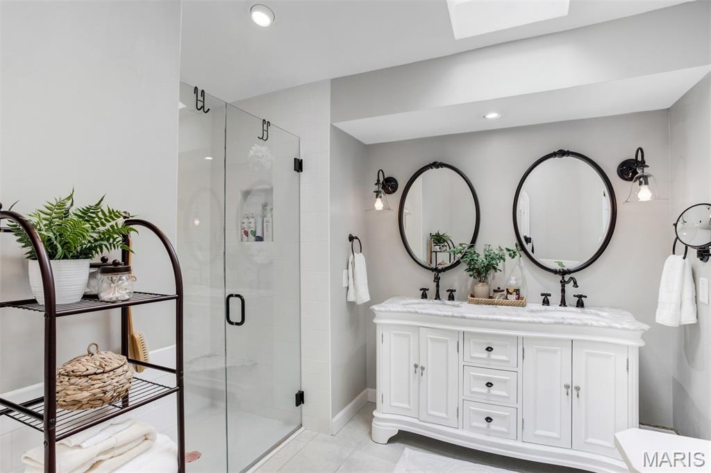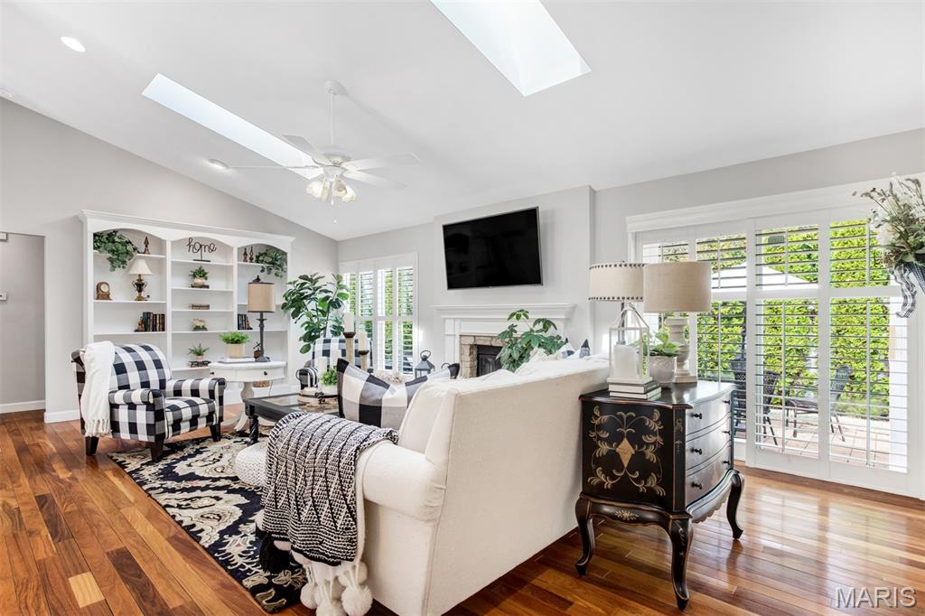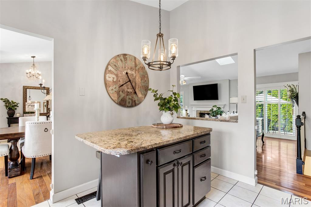 A welcoming sense of warmth and thoughtful design is felt as you enter, setting the tone for the rest of the home. The dining space carries that same feeling—defined yet connected, creating an inviting place for both everyday meals and more intentional gatherings. Just beyond, the kitchen is positioned for both flow and function, with two entry points—one from the dining room and one from the hall off the great room—allowing movement throughout the home to feel natural and easy. A wall cut-out opens the kitchen to the great room, keeping the spaces connected while still giving each area its own sense of place. Vaulted ceilings carry into the space, adding a light, airy feel that makes the kitchen feel more open and inviting. Granite countertops and stainless steel appliances bring a clean, timeless look, while the center island offers practical workspace. A window over the sink draws in natural light, keeping the space bright and relaxed. The great room opens up with vaulted ceilings that give the space a light, relaxed feel, elevated by recessed lighting and multiple skylights that fill the room with natural light throughout the day. The fireplace becomes a true focal point, framed by large windows on one side and a sliding door to the patio on the other. A wall of custom shelving adds both character and function, while Palladian shutters throughout bring a timeless, refined touch. Beautiful hardwood floors extend through the great room, dining area, and hallway, tying everything together with a warm, elegant flow. The split-bedroom floorplan offers privacy where it matters most, with the primary suite set apart as its own retreat. Vaulted ceilings carry through, giving the bedroom a spacious, calming feel that’s both open and relaxing. The primary bath has been beautifully reimagined into a true spa-like retreat, centered around a freestanding soaking tub set beneath a custom arched detail. A skylight fills the space with soft natural light, highlighting the refined finishes, upgraded fixtures, and glass walk-in shower. The design feels elevated and intentional throughout—creating a space that is both striking and deeply relaxing. The home reveals even more as you make your way to the lower level, accessed by an open staircase thoughtfully positioned off the central hallway. This transition feels effortless and inviting, leading into a beautifully finished space designed for both comfort and versatility. The lower level opens into a spacious living area where everything just feels easy—room to spread out, settle in, and enjoy the kind of space that adapts to whatever the day calls for. Soft recessed lighting creates a warm, relaxed atmosphere, while a custom bar area adds both character and function—perfect for hosting or unwinding. An additional room offers flexibility for a home office, craft space, or playroom. Open the living room doors to a private backyard that feels quiet and tucked away, offering a natural sense of separation and calm. The layout allows the space to open up comfortably, giving you room to relax, unwind, and enjoy the outdoors in a setting that feels both peaceful and private.