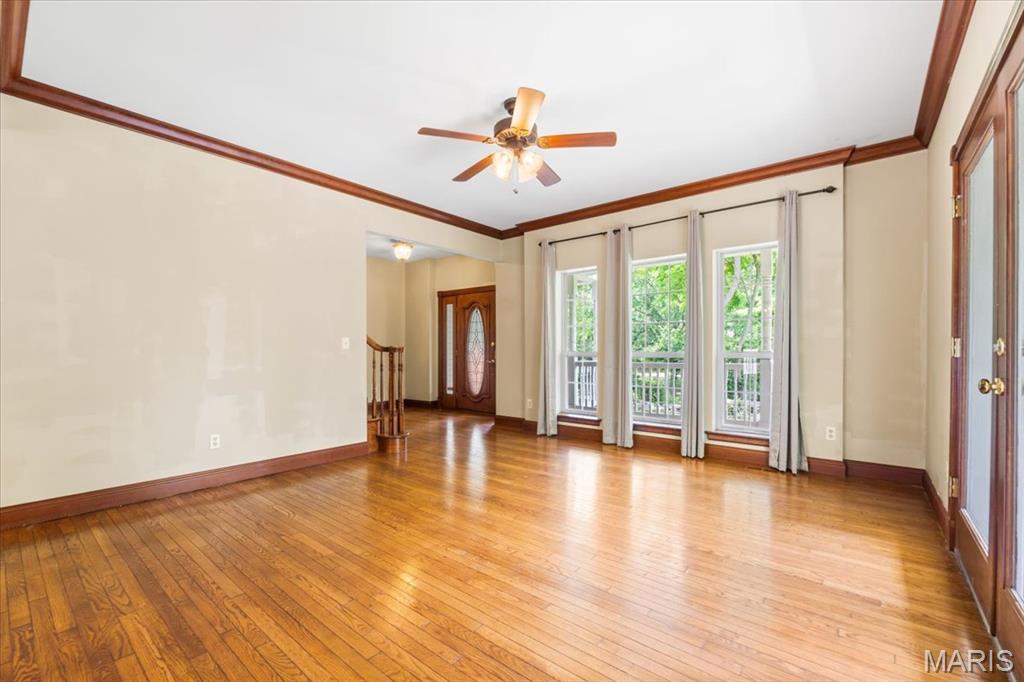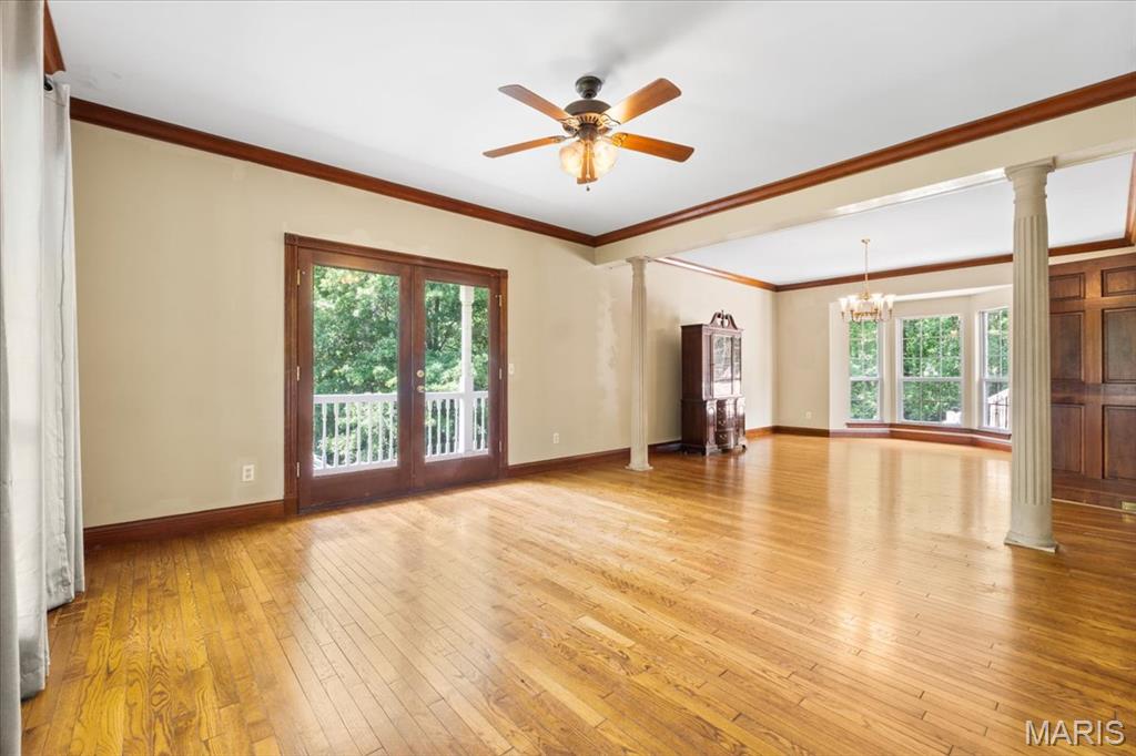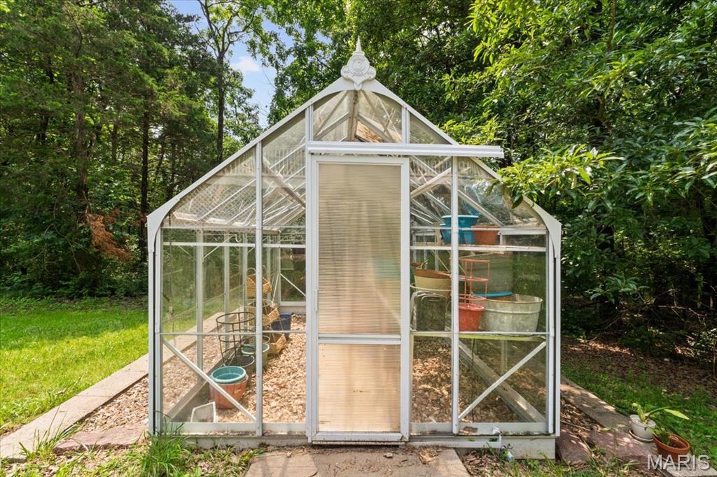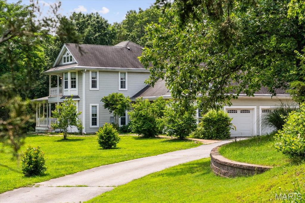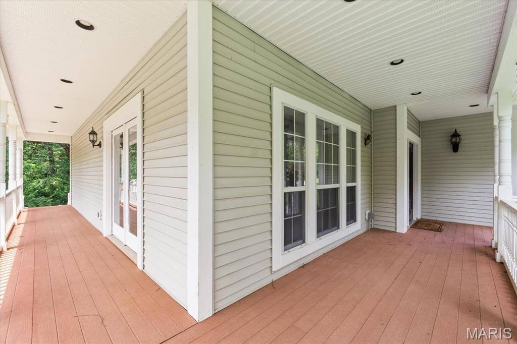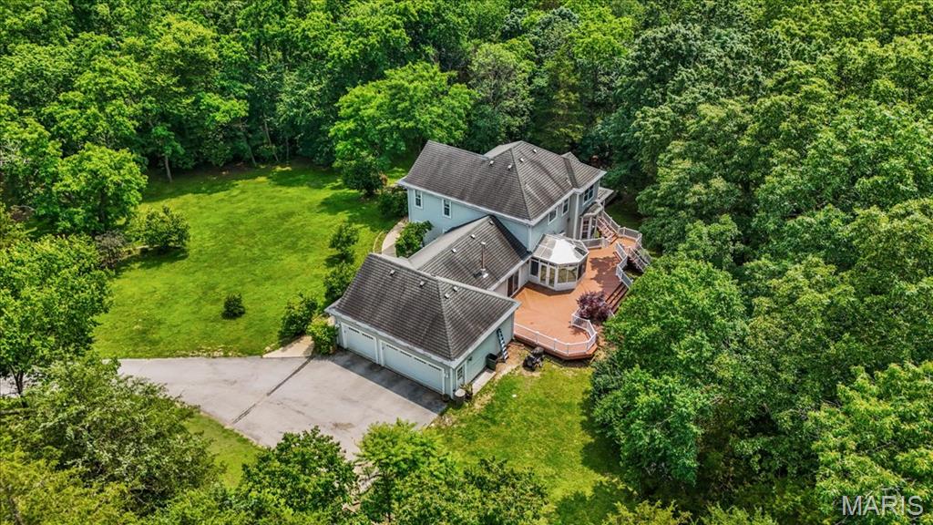 Welcome to 1519 Scofield Valley Lane, located in the highly desirable Wildwood area! A level driveway leads to a charming 1.5 story home resting gracefully on 3+/- acres providing a peaceful and tranquil atmosphere. The home boasts 4 Bedrooms, 5 full baths, with 4,088+/- sq ft of living space. A wrap around deck allowing expansive scenic views of the acreage & greets you as you step inside the entry foyer. Sitting/dining room features original wood flooring, columns, bay window, walkout to deck & swing door to Kitchen. Eat-in kitchen flaunts custom cabinets, granite counters, job finished wood floors, movable center island & NEWER stainless steel appliances. Main level bedroom, features a bay window, built-in bookcases, French door entry and ensuite full bath. Completing the main level living space is a sunroom, laundry room & hearth room w/wood burning freestanding stove. Upper level primary suite w/job finished wood floors, bay window, private deck, separate walk-in closets and double sink vanity, shower & jet tub. 2 Additional bedrooms w/job finished wood floors, slide closets & share a hall full bath. Walk-out lower level boasts a large rec room with a wet bar, full bath & bonus room. Outside, you will enjoy a shed & greenhouse w/electricity. Within the Rockwood School District w/easy access to Hwy 100/Manchester Rd, shopping, dining, & Wildwood amenities. Must see!