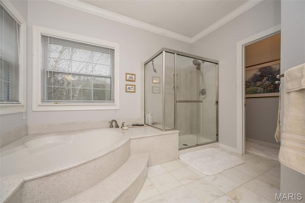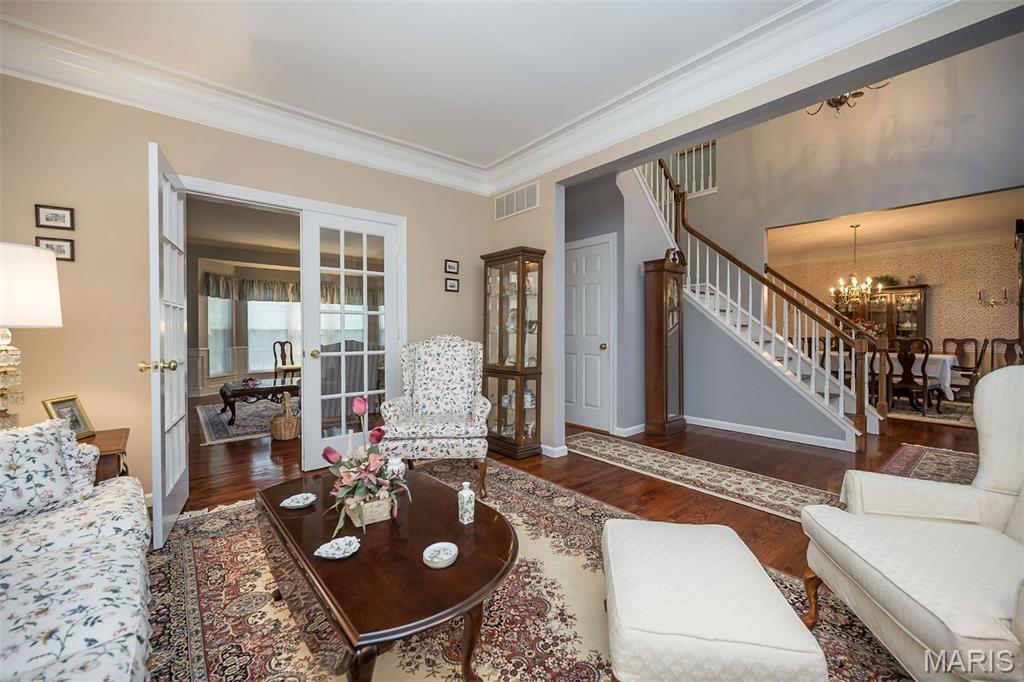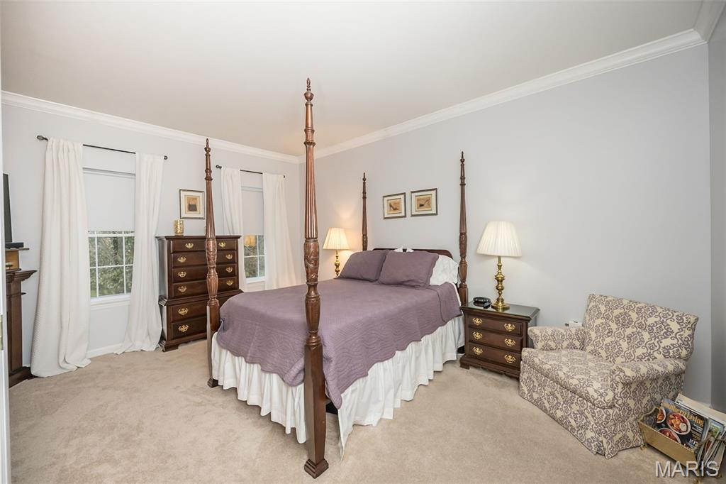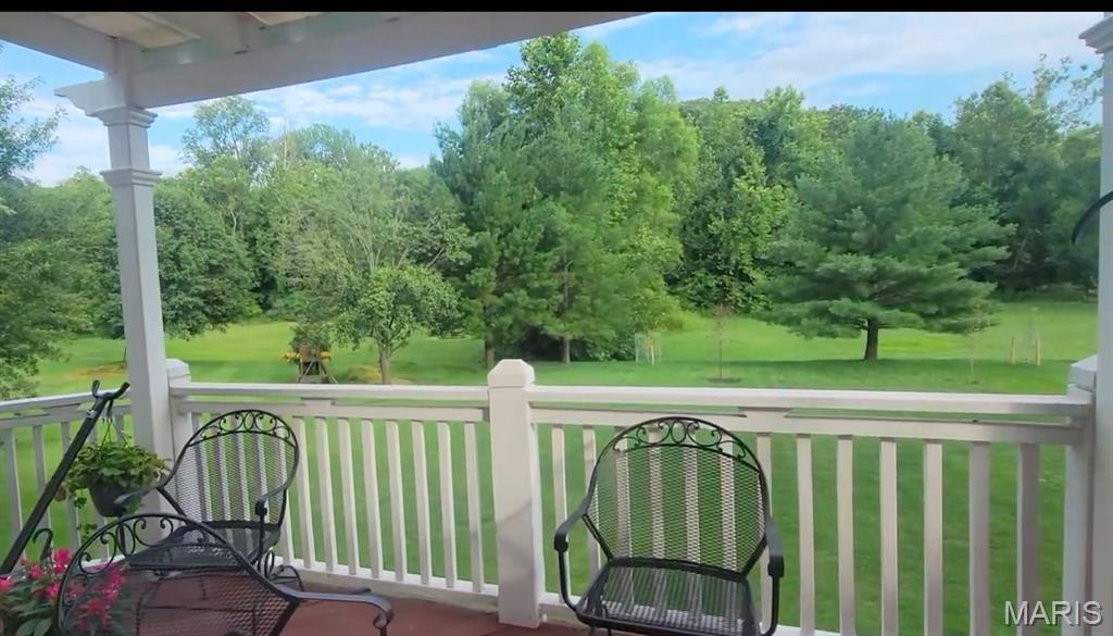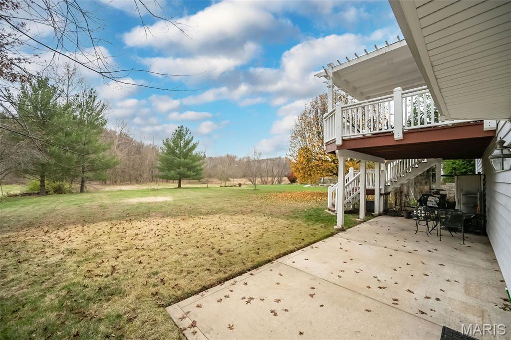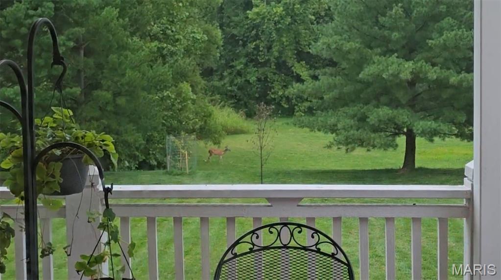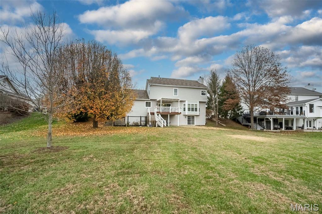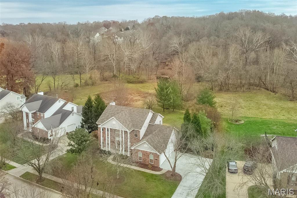 Welcome to Wilderness Trails, where luxury suburban living meets the rare joy of having untouched nature as your everyday backdrop! Situated on nearly ½ acre, this stately 4-bedroom, 3.5-bath Colonial offers nearly 2,900 sq ft of refined living space and backs to 25 acres of protected natural beauty along Bonhomme Creek—perfect for nature walks, wildlife watching, exploring for morels in the spring, and embracing the great outdoors. Best of all, bow hunting is permitted on this land, creating a truly unique lifestyle opportunity! Inside, elegance and thoughtful upgrades shine at every turn. Both the main and second floors feature 9-foot ceilings, extensive crown molding, updated hardwood floors, and a custom staircase with handcrafted millwork. The living and dining spaces are elevated with wainscoting and chair rail, creating a timeless and welcoming atmosphere. The expanded 20-foot kitchen is ideal for daily living and entertaining, showcasing Merillat cherry cabinetry, heated flooring, generous prep space, and peaceful views of the wooded acreage beyond. Upstairs, the primary suite is a true retreat with luxurious marble flooring, a granite dual vanity, corner soaking tub, and separate shower. The thoughtful bedroom layout includes one ensuite bedroom with its own private bath, while two additional bedrooms share a Jack-and-Jill bath—ideal for comfortable family living and hosting guests. Step outside to a custom covered deck overlooking sweeping green space and the serene setting of Bonhomme Creek—an outdoor backdrop that feels worlds away. Yet, you’re just minutes from the shopping, dining, and entertainment of Chesterfield Valley, including outlet shopping, Dierbergs, Sam’s Club, Macy’s, and more, with easy highway access and a convenient commute to Clayton and downtown St. Louis. Located near award-winning Chesterfield Elementary, a Blue Ribbon School just around the corner, with the bus stop directly across the street, and close to private school options along Wild Horse Creek. Peace-of-mind updates include new insulated siding, soffits, gutters, NEW ROOF Nov 2025, updated hardwood flooring, remodeled baths, a custom deck cover, new A/C 2024, a sprinkler system, and a spacious insulated 3-car garage. The convenience of subdivision living paired with the serenity of true natural surroundings—right in your own backyard. This is more than a home; it’s a lifestyle!