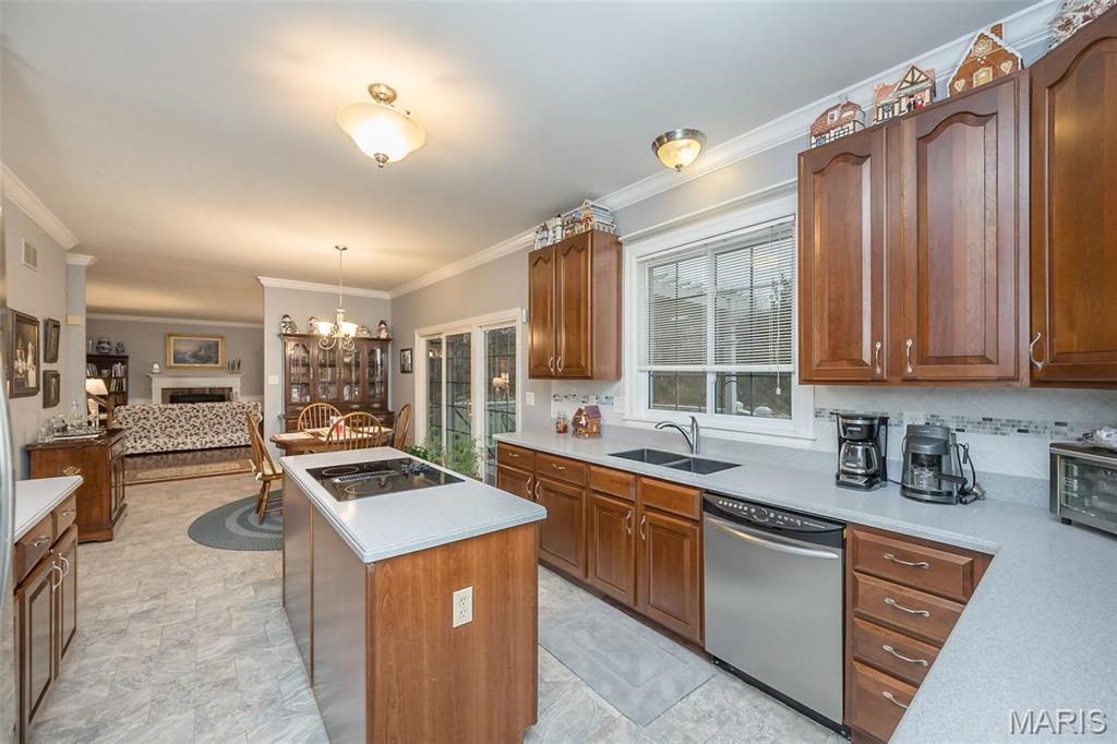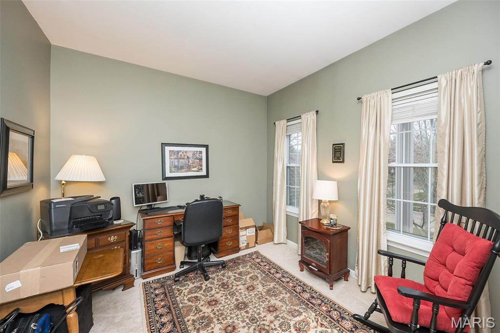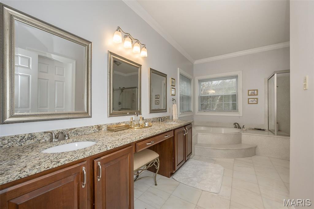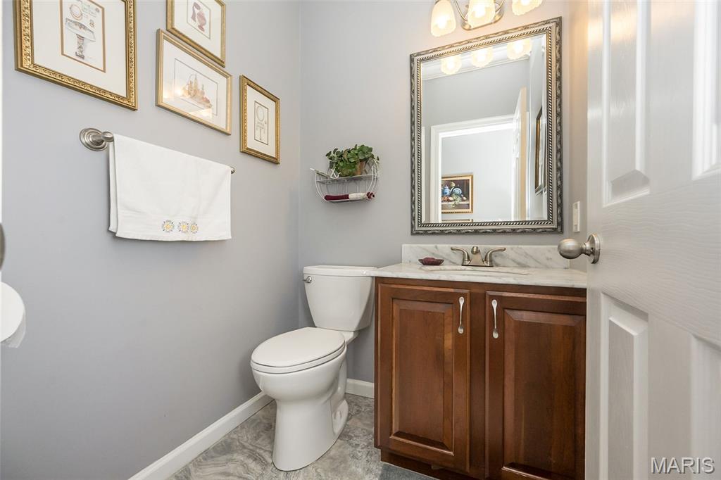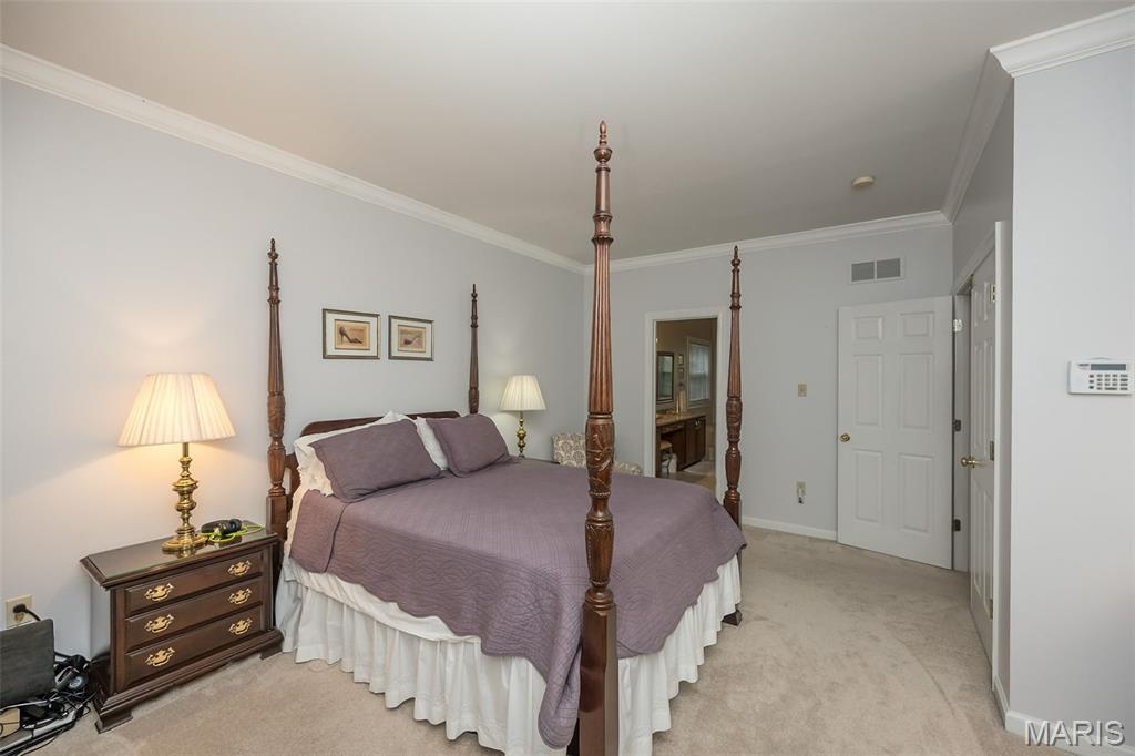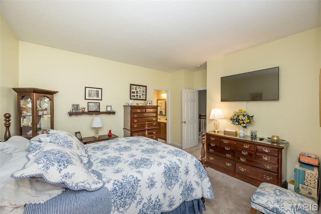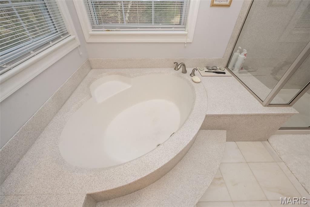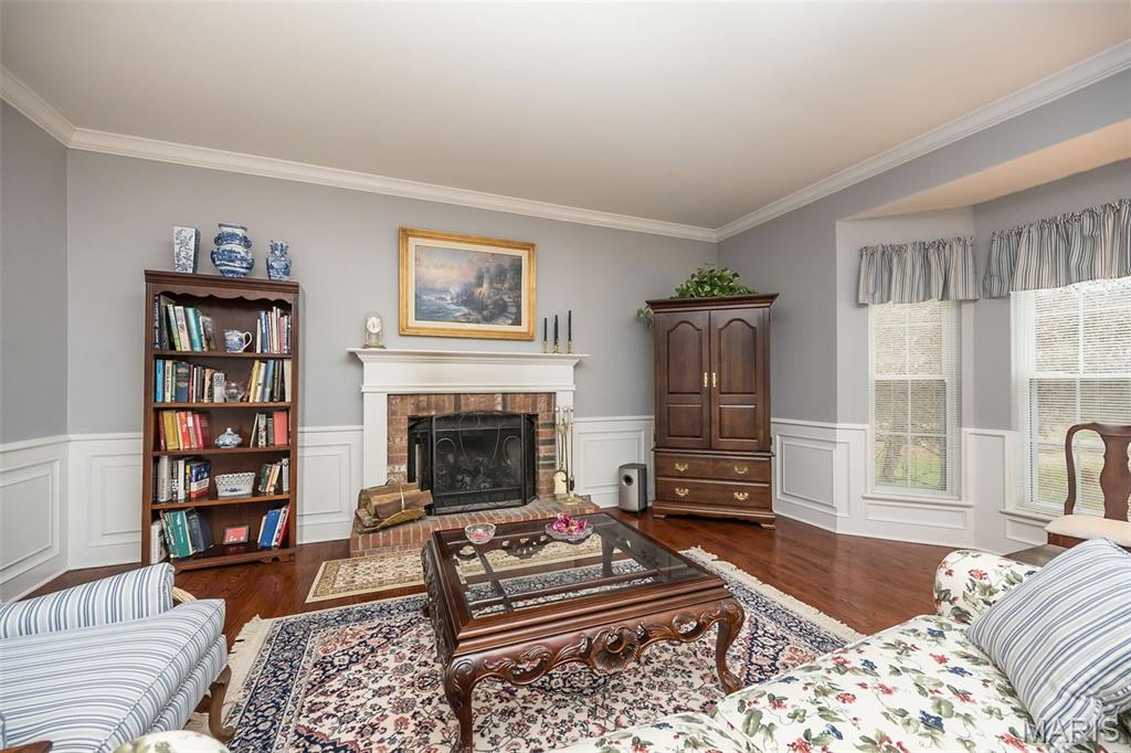 Welcome to Wilderness Trails, where luxury suburban living meets the rare joy of having untouched nature as your everyday backdrop! Situated on nearly ½ acre, this stately 4-bedroom, 3.5-bath Colonial offers nearly 2,900 sq ft of refined living space and backs to 25 acres of protected natural beauty along Bonhomme Creek—perfect for nature walks, wildlife watching, exploring for morels in the spring, and embracing the great outdoors. Best of all, bow hunting is permitted on this land, creating a truly unique lifestyle opportunity! Inside, elegance and thoughtful upgrades shine at every turn. Both the main and second floors feature 9-foot ceilings, extensive crown molding, updated hardwood floors, and a custom staircase with handcrafted millwork. The living and dining spaces are elevated with wainscoting and chair rail, creating a timeless and welcoming atmosphere. The expanded 20-foot kitchen is ideal for daily living and entertaining, showcasing Merillat cherry cabinetry, heated flooring, generous prep space, and peaceful views of the wooded acreage beyond. Upstairs, the primary suite is a true retreat with luxurious marble flooring, a granite dual vanity, corner soaking tub, and separate shower. The thoughtful bedroom layout includes one ensuite bedroom with its own private bath, while two additional bedrooms share a Jack-and-Jill bath—ideal for comfortable family living and hosting guests. Step outside to a custom covered deck overlooking sweeping green space and the serene setting of Bonhomme Creek—an outdoor backdrop that feels worlds away. Yet, you’re just minutes from the shopping, dining, and entertainment of Chesterfield Valley, including outlet shopping, Dierbergs, Sam’s Club, Macy’s, and more, with easy highway access and a convenient commute to Clayton and downtown St. Louis. Located near award-winning Chesterfield Elementary, a Blue Ribbon School just around the corner, with the bus stop directly across the street, and close to private school options along Wild Horse Creek. Peace-of-mind updates include new insulated siding, soffits, gutters, NEW ROOF Nov 2025, updated hardwood flooring, remodeled baths, a custom deck cover, new A/C 2024, a sprinkler system, and a spacious insulated 3-car garage. The convenience of subdivision living paired with the serenity of true natural surroundings—right in your own backyard. This is more than a home; it’s a lifestyle!