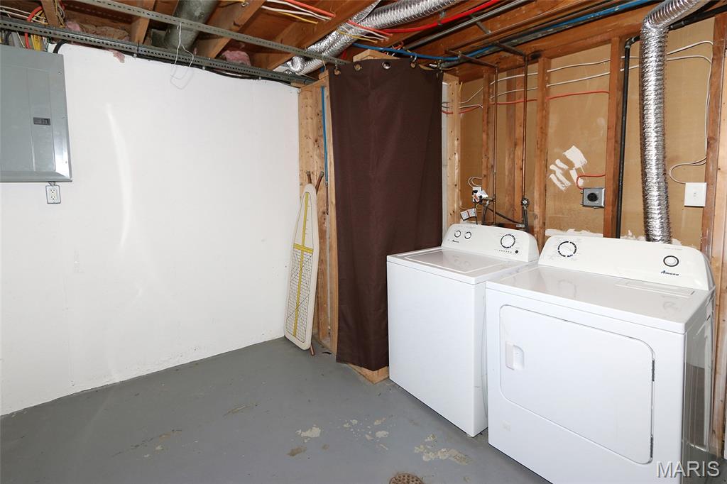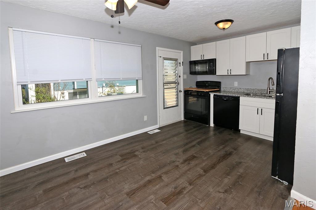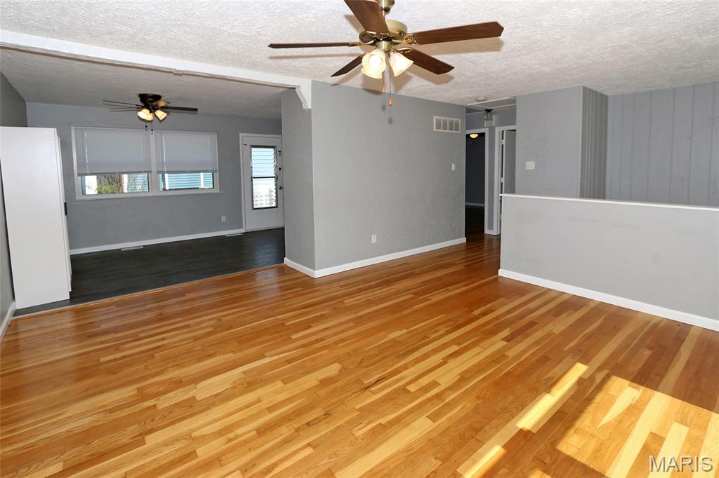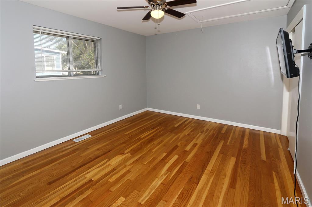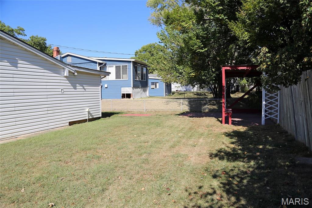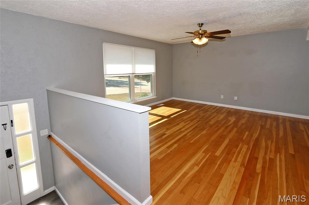MOVE-IN READY! 4BR/2BA, 1200+ SQ FT! PATTONVILLE SCHOOL DISTRICT! Step into this well-maintained home on a large corner lot with welcoming 2-story open split foyer. Spacious living room is to your left w/wood floors & 2 large windows that overlook the front yard. Living room is open to the eat-in kitchen w/newer luxury vinyl plank flooring, granite counters, white cabinets, & black appliances. Refrigerator stays! Door from the kitchen out to the level, fully fenced back yard w/covered patio. Back inside, wood floors continue down the hall & into the 2 main floor bedrooms, both w/ceiling fans. Full hall bath w/shower/tub combo plus newer vanity, toilet, & luxury vinyl plank flooring. Lower level is finished & boasts 2 additional bedrooms, full bath, and nice-sized family room w/large window offering loads of natural light. Laundry room w/door to walk-up & back yard; Amana washer & dryer stay! Attached 2-car garage w/bonus room off the back--can be used as an office or additional storage! Newer window blinds throughout the home. Just off McKelvey Road & close to shopping & restaurants; 15 minute walk to Pattonville High School or Maryland Heights Community Center!